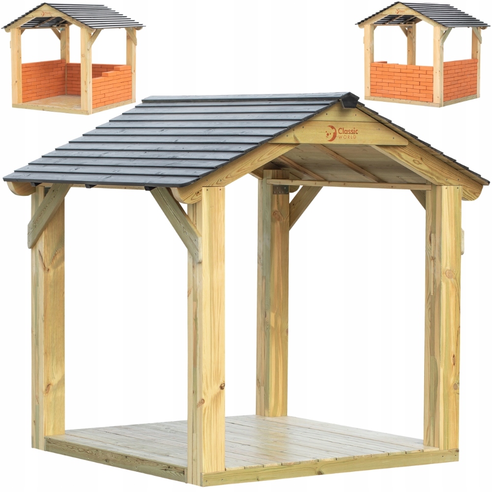 Альтанка від авторитетної марки Класичний світ - ідеальний доповнення до ігрового майданчика! Продукт виготовлений з високої якості деревини , пофарбована не токсична просочення , повністю безпечна для дітей. велике задоволення може бути прокладання стін додому. Високий якості продукту!