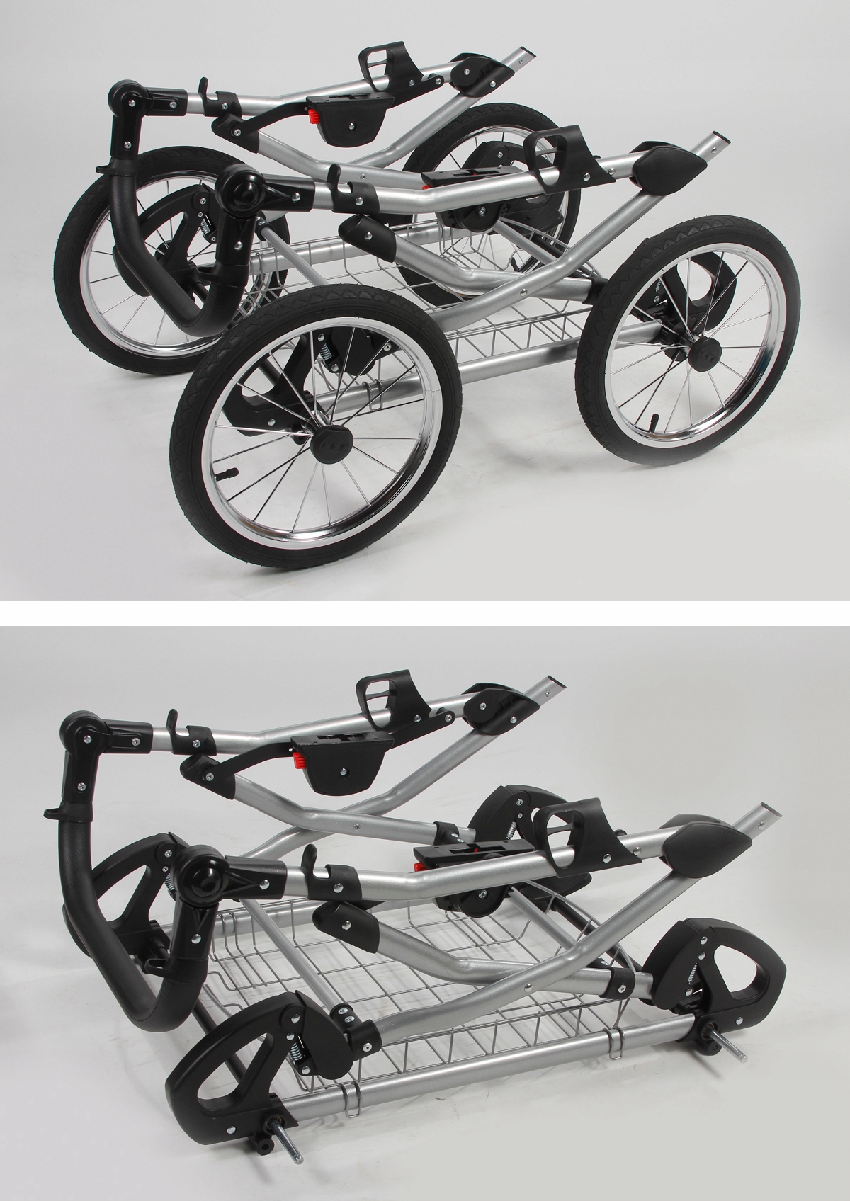 - Великі, зручні 14" колеса з підкачуванням з підшипниками та хромованими ободами.