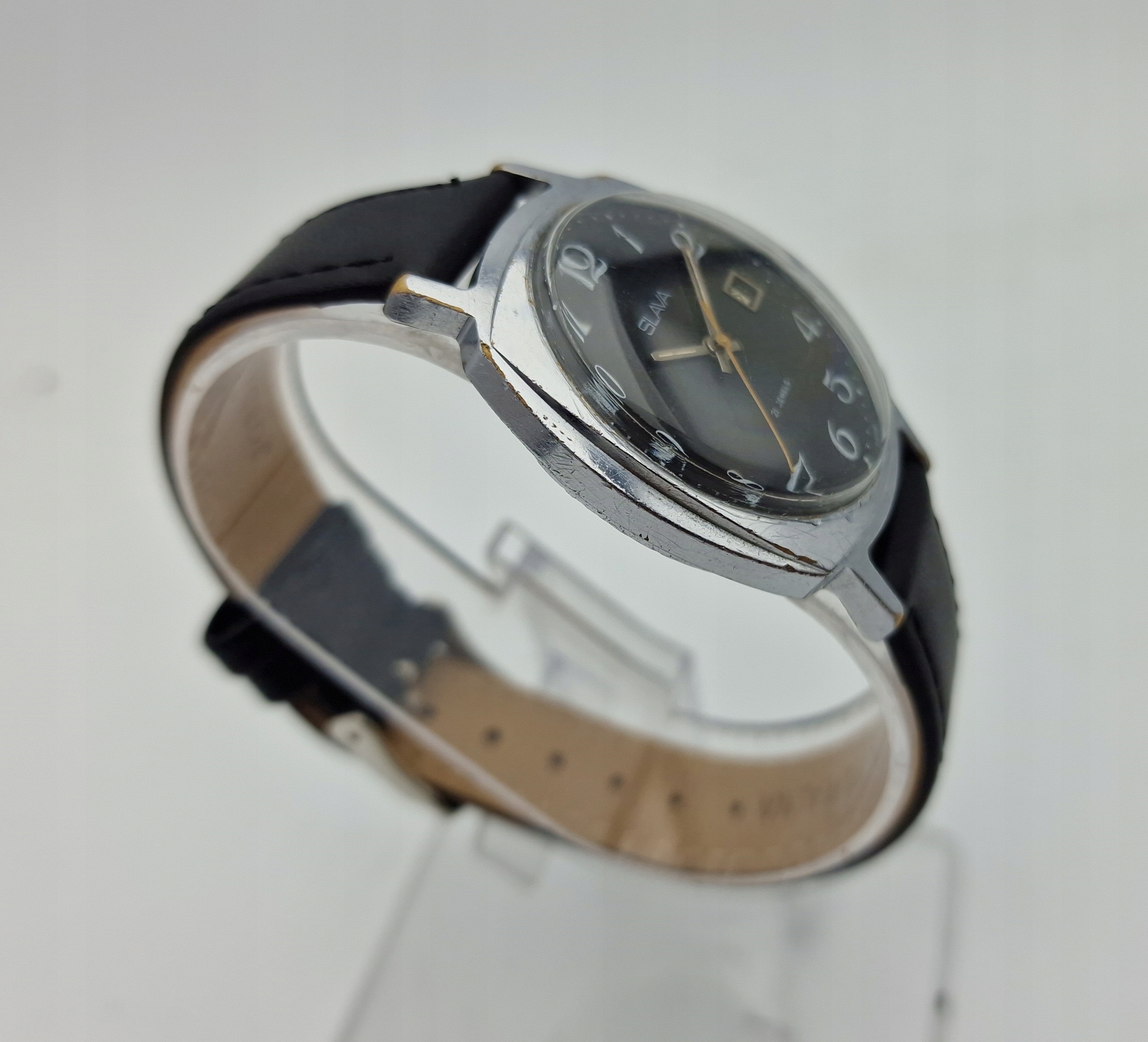 - Чорний металевий циферблат зі срібними годинниковими мітками та покажчиком дати на третій годині. Циферблат підписаний: «СЛАВА 21 КРАГОЦІННОСТІ, ЗРОБЛЕНО В СРСР». Циферблат в ідеальному стані.
