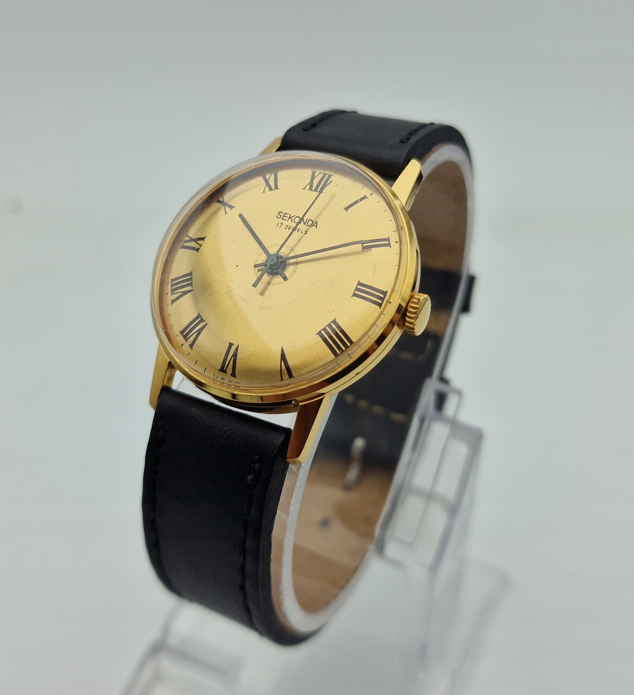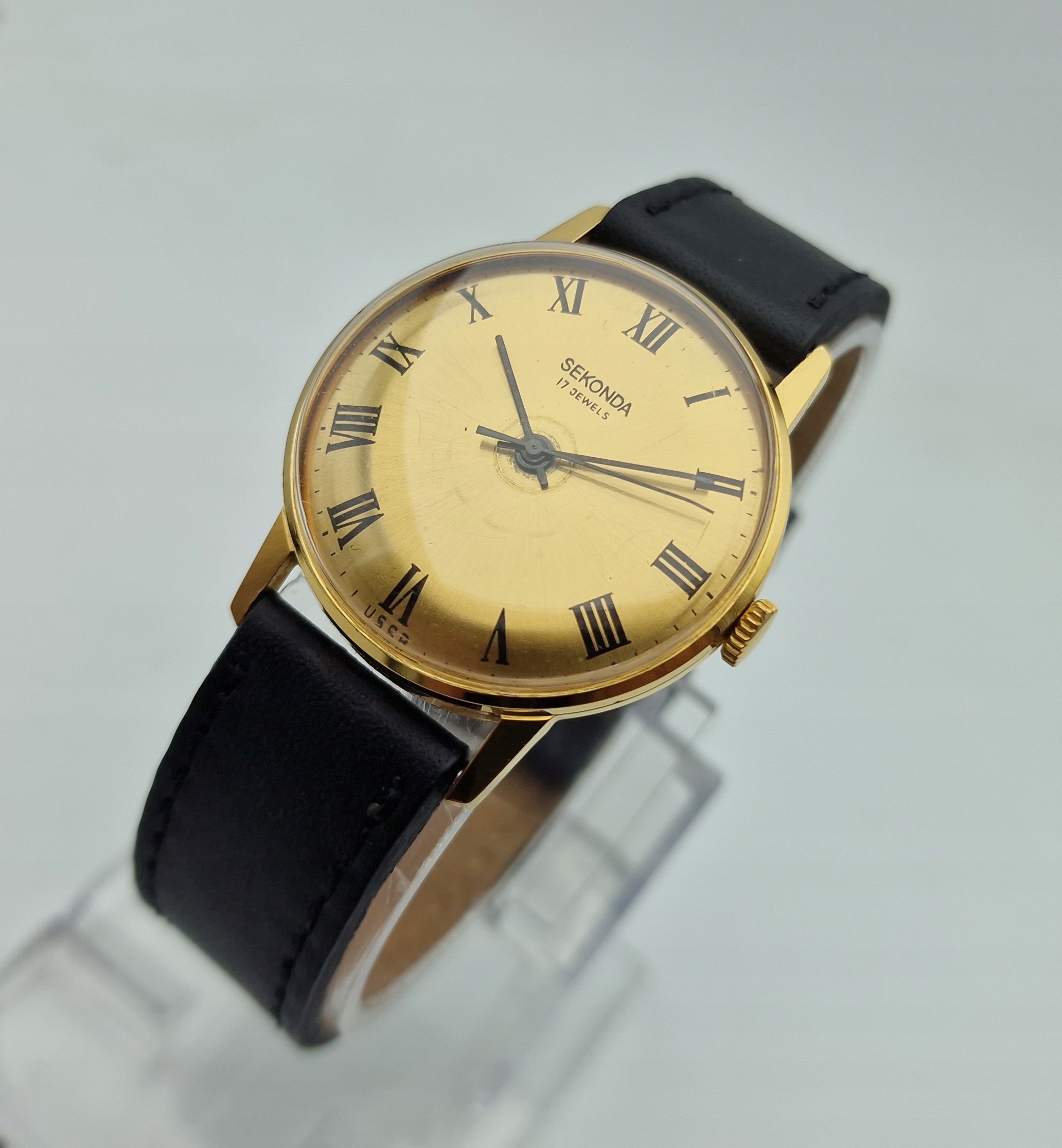 - Золотий металевий циферблат із чорними римськими цифрами. Циферблат підписаний: «СЕКОНДА, 17 КОШТОВНОСТЕЙ, СРСР». Циферблат майже в ідеальному стані, як на фото.