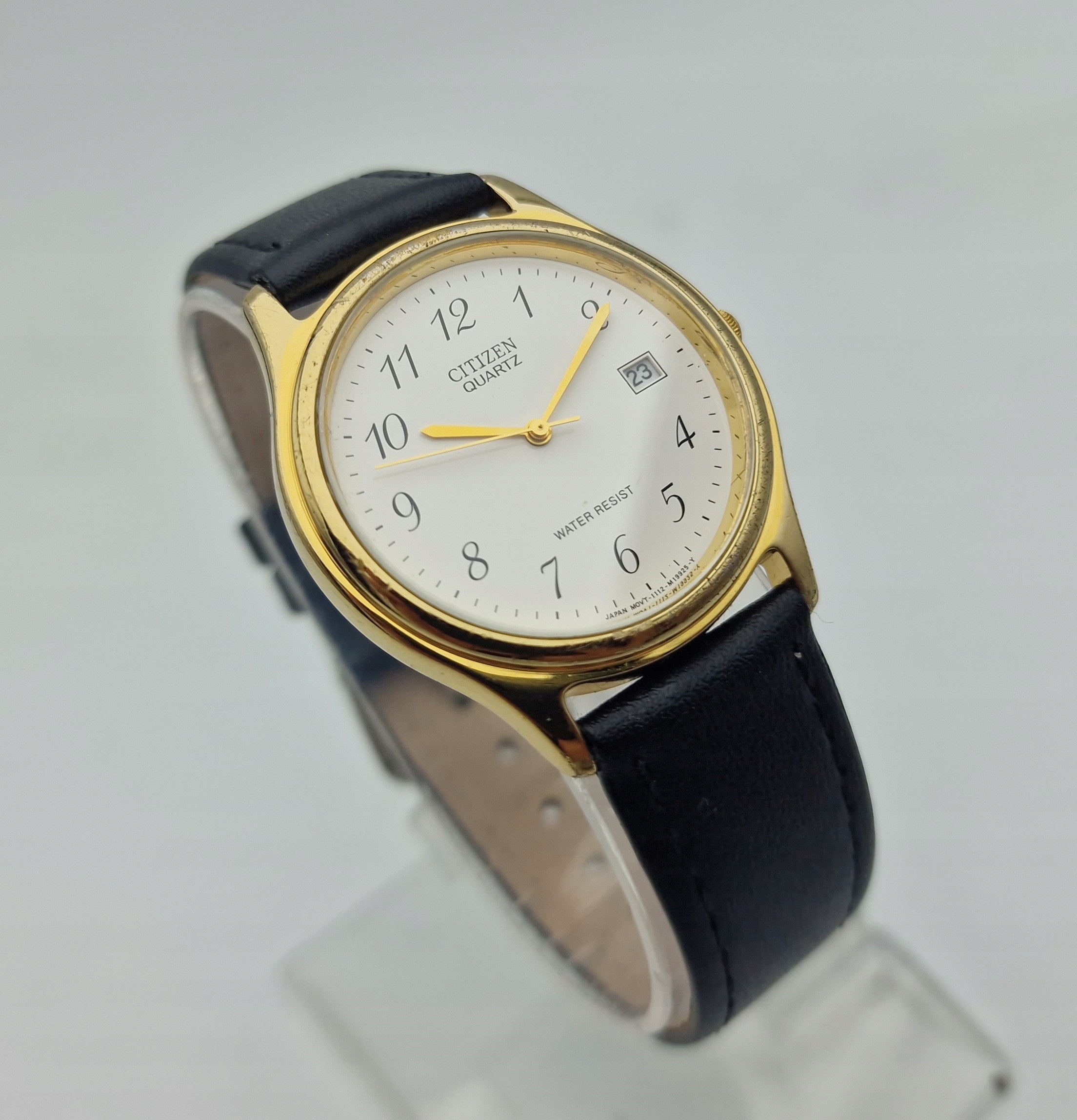 - Білий циферблат із чорними арабськими цифрами та покажчиком дати на третій годині. Оригінальний циферблат із підписом: «CITIZEN QUARTZ, WATER RESISTANT, JAPAN». Циферблат в ідеальному стані, видно на фото.