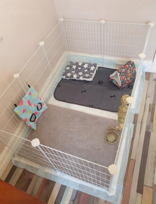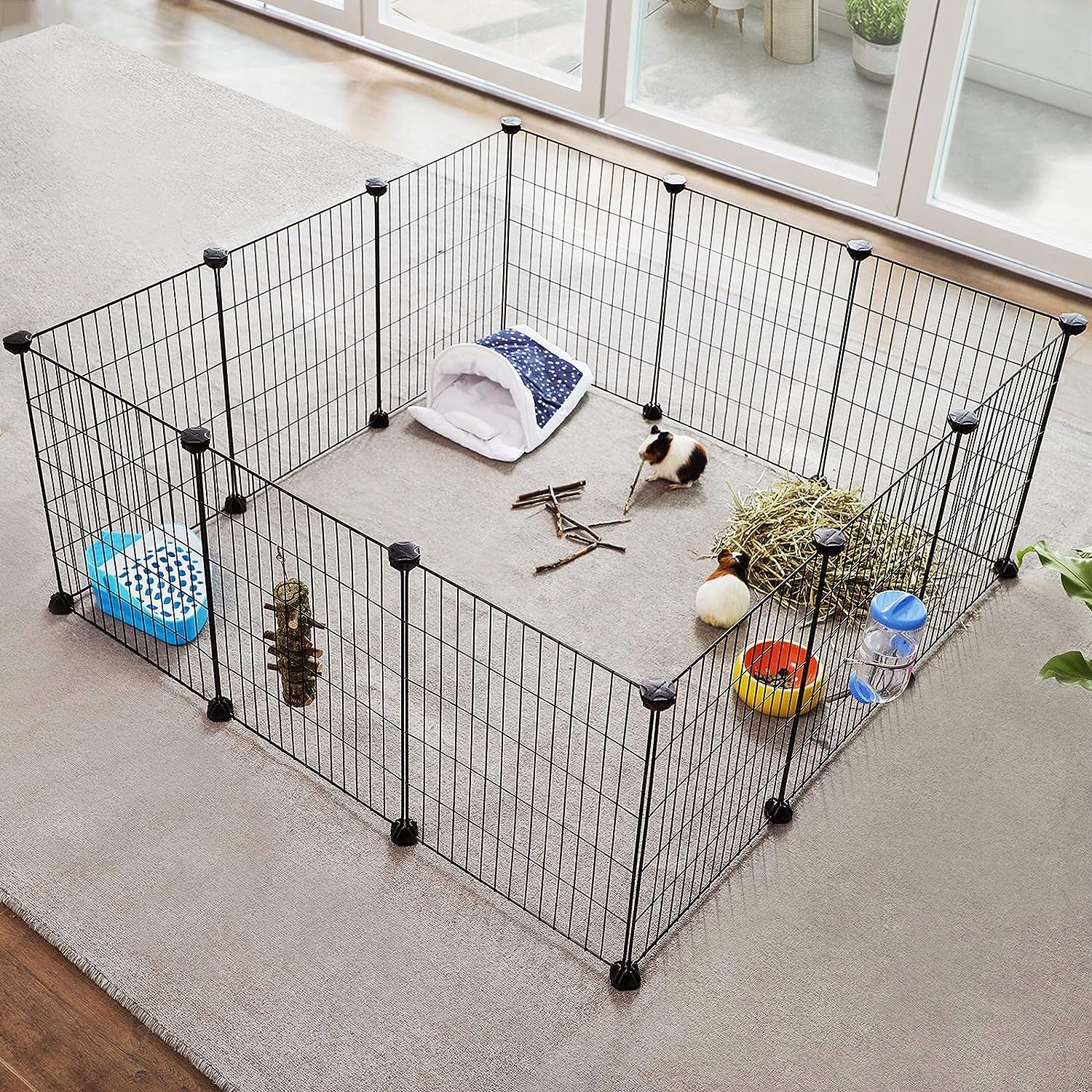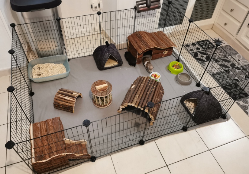 Складна ручка призначена для маленьких домашніх тварин, таких як гризуни або цуценята. Це ідеальне рішення для власників тварин, які хочуть забезпечити своїм улюбленцям безпечну зону. Цей корпус складається з12 панелей розміром 46 х 36,5 смякі з'єднані за допомогою пластикових з'єднувальних елементів і хомутів. Завдяки цій конструкції ми можемо легко адаптувати форму клітки до індивідуальних вимог. Клітка забезпечує правильну циркуляцію повітря та не займає багато місця в складеному стані. Численні варіанти конфігурації дозволяють нашим вихованцям почуватися в безпеціяк вдома, так і на вулиці. Завдяки цьому ймовірність будь-яких травм мінімальна, і ми також можемо бути впевнені, що наш вихованець не перекине предмети в будинку. або квартира.