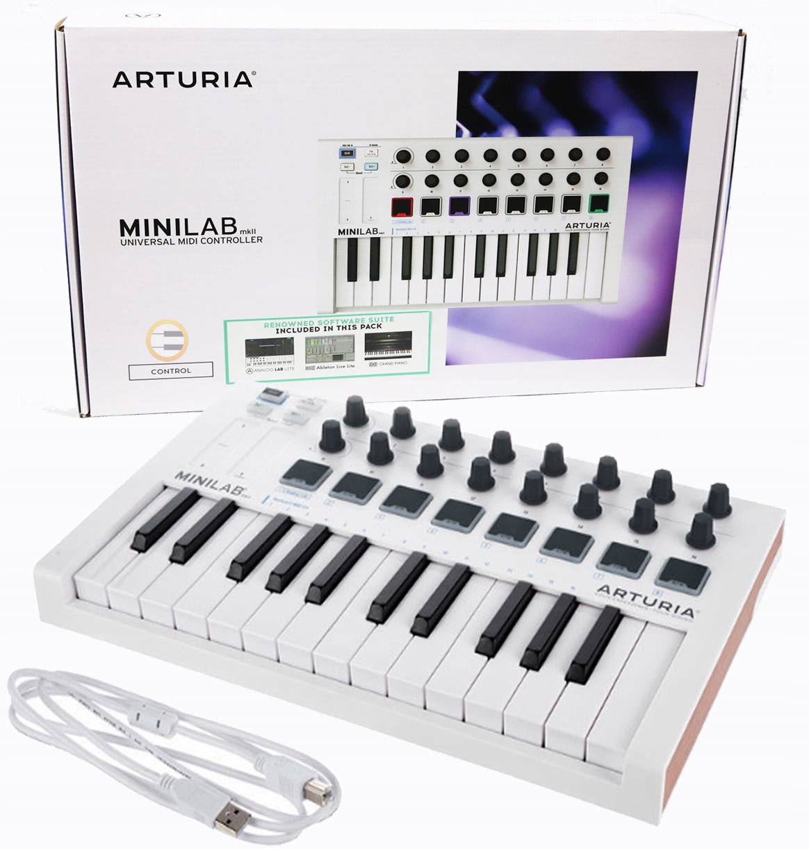 MiniLab MkII — це високоякісний контролер, який надає повний доступ до віртуальних інструментів і контроль над програмним забезпеченням. Цей невеликий елемент обладнання поставляється в комплекті з великою звуковою бібліотекою Analog Lab Lite, професійною емуляцією концертного рояля - UVI Grand Piano Model D і виробничою платформою світового класу - Ableton Live Lite. MiniLab MK II — готовий до використання продукт!