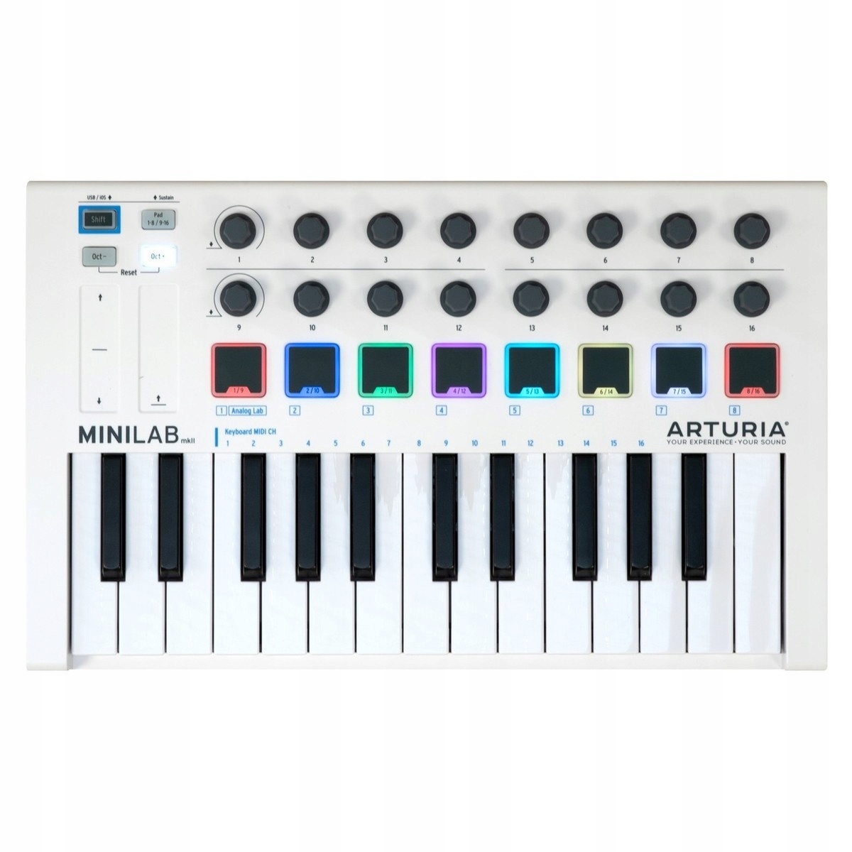 Невеликий корпус MiniLab містить висококласні SlimKeys клавіатура (25 клавіш), 16 кодерів, 8 кольорових панелей RGB і дві сенсорні смужки, що функціонують як колесо Pitch Bend або модуляції (або будь-що інше, що ми призначаємо через MIDI). MiniLab MkII займає мало місця на вашому столі, але є справжнім командним центром вашої студії. Незалежно від того, чи хочете ви поекспериментувати з басовою лінією, налаштувати звучання свого улюбленого синтезатора або, можливо, постукувати новий ритм на педах - це дуже легко з MiniLab MkII!