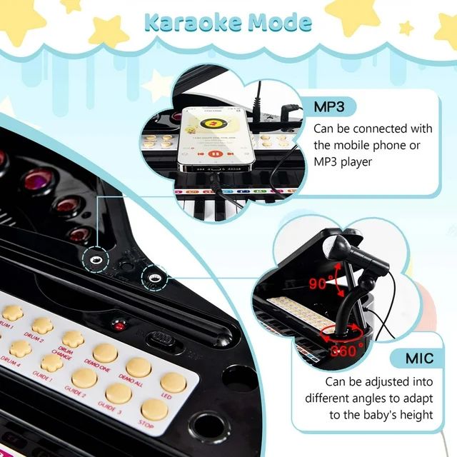 【Функціональний режим караоке】 Завдяки мікрофону діти можуть вправлятися у співі під час гри на піаніно. Інтерфейс MP3 можна підключити до мобільного телефону або MP3-плеєра. У той же час інтерфейс MIC підключений до мікрофона, який можна регулювати під різними кутами, щоб адаптуватись до росту дітей.
