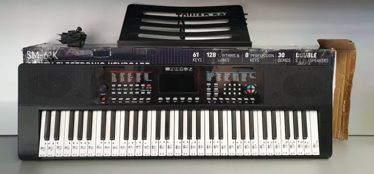 Зміст: 61-клавішна клавіатура, джерело живлення, музичні наклейки - уже наклеєні на клавіші