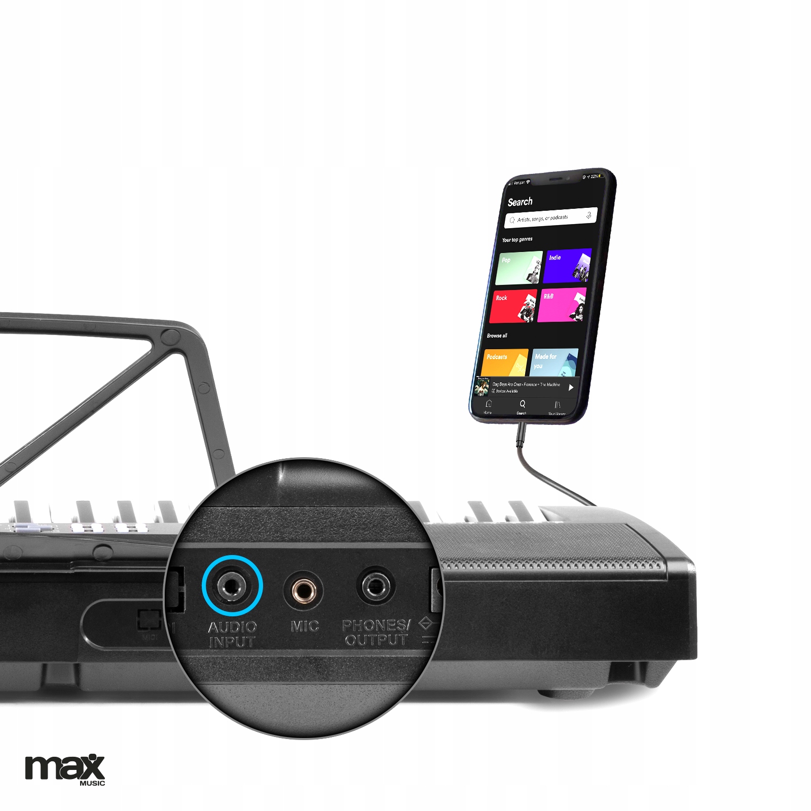 З MAX KB5 тепер навчитися грати на клавіатурі веселіше, ніж будь-коли. MAX KB5 — це клавіатура з 61 клавішею з підсвічуванням, яка допоможе вам навчитися грати на клавіатурі. Клавіші «повнорозмірні», тому KB5 підходить і як клавіатура для дітей, і як клавіатура для дорослих. Завдяки цьому вся родина може грати та тренуватися досхочу на цій чудовій інноваційній клавіатурі. Підключивши навушники, ви можете займатися в тиші, а оскільки клавіатура також може працювати від батарейок, ви не обов’язково прив’язані до розетки.