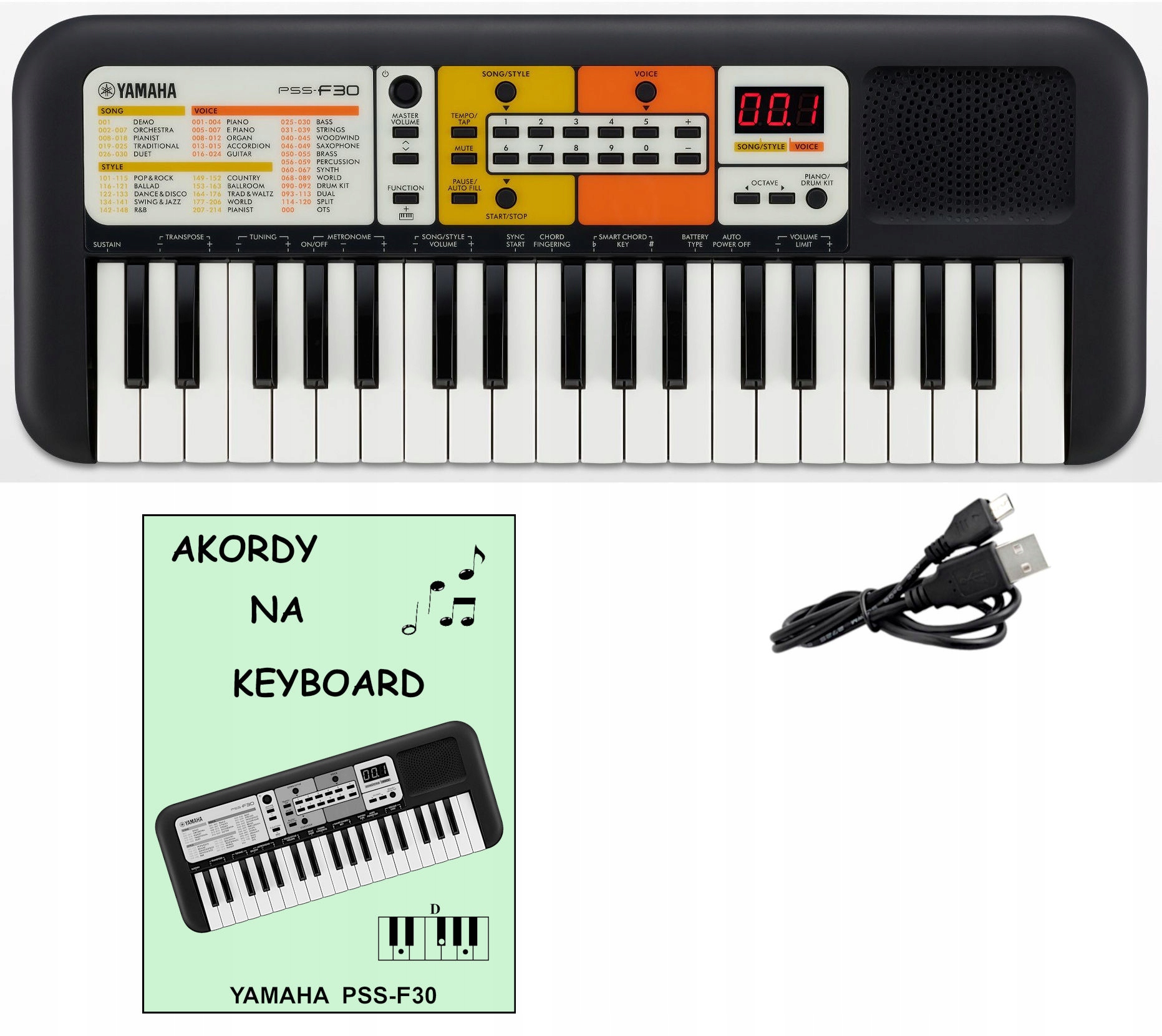 PSS-F30 використовує лише одну октаву з лівого боку клавіатури для автоматичного акомпанементу. Тому всі акорди в посібнику розміщені в одній октаві, що дає можливість грати їх на цій клавіатурі.