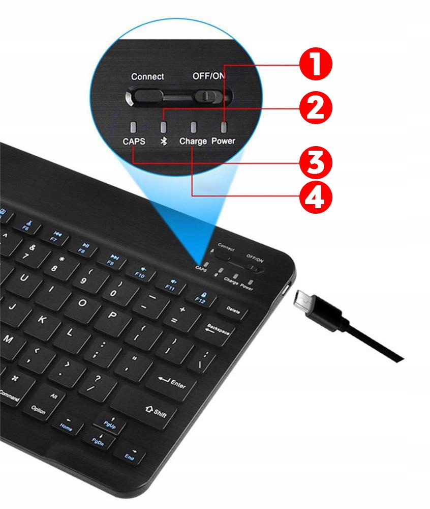 - Ви заряджаєте клавіатуру залежно від циклу заряджання. Є діод, який інформує про розряд і зарядку клавіатури.