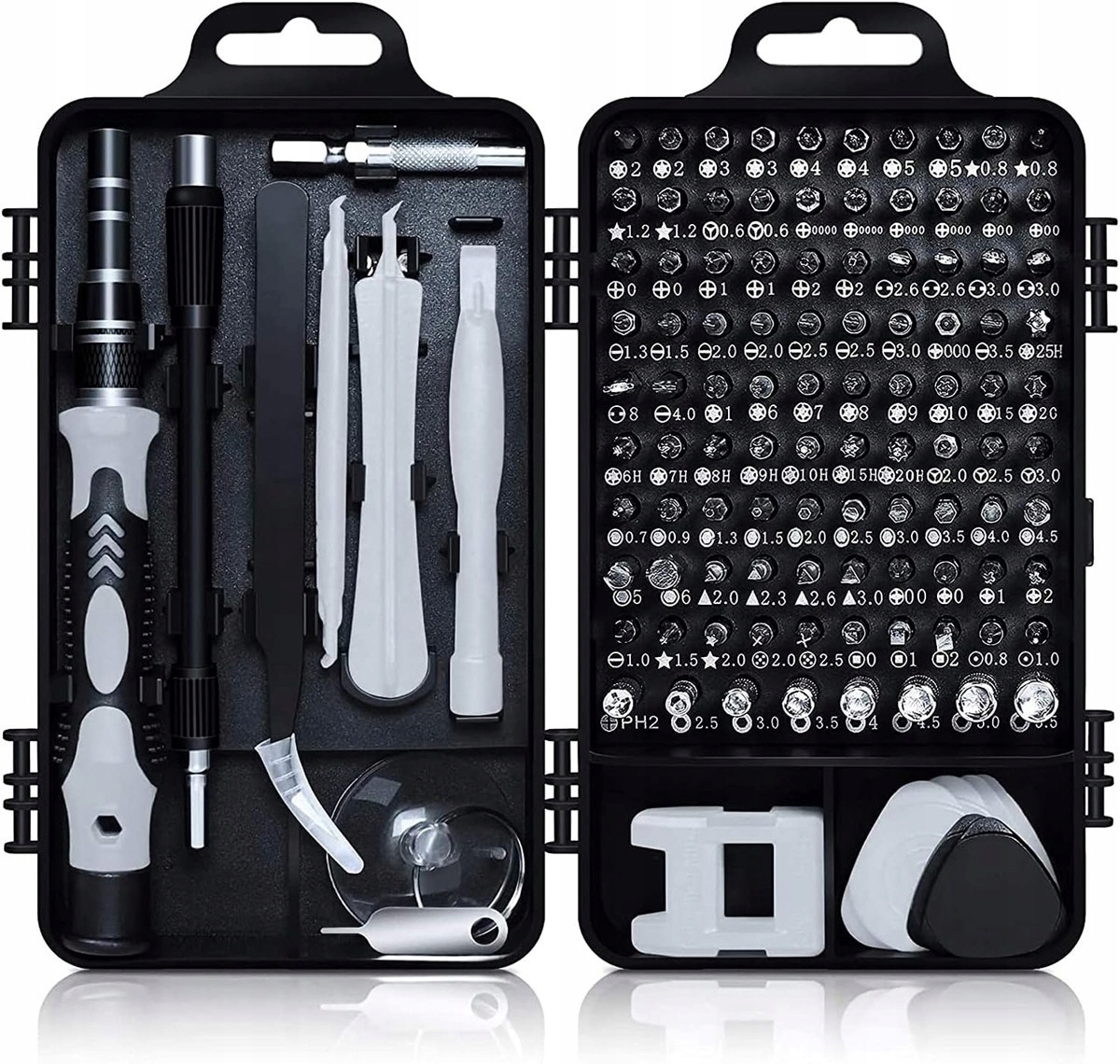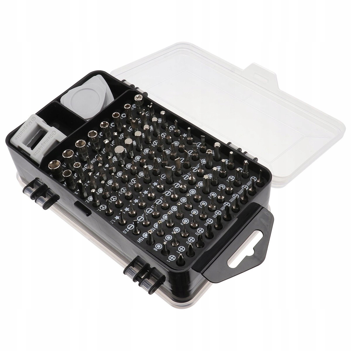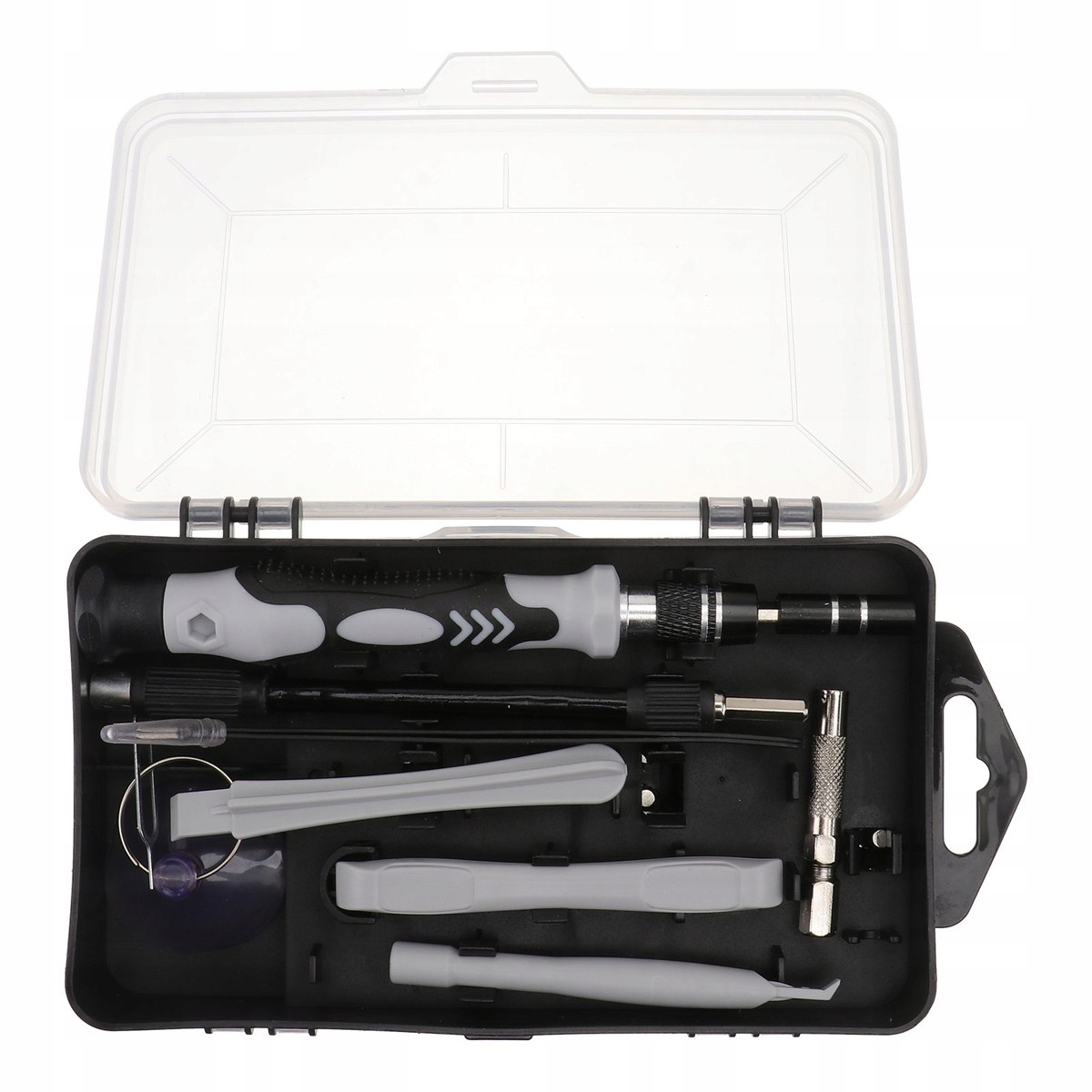 Кожен елемент набору ретельно упаковано у зручному корпусі, , що полегшує зберігання та транспортування. Змінні шматочки різних розмірів і форм можна встановити на універсальній ручці, що дозволяє заощадити простір у майстерні та панелі інструментів. Цей повний набір буде використаний для ремонту практично будь -якого пристрою і є незамінним інструментом у кожному будинку.