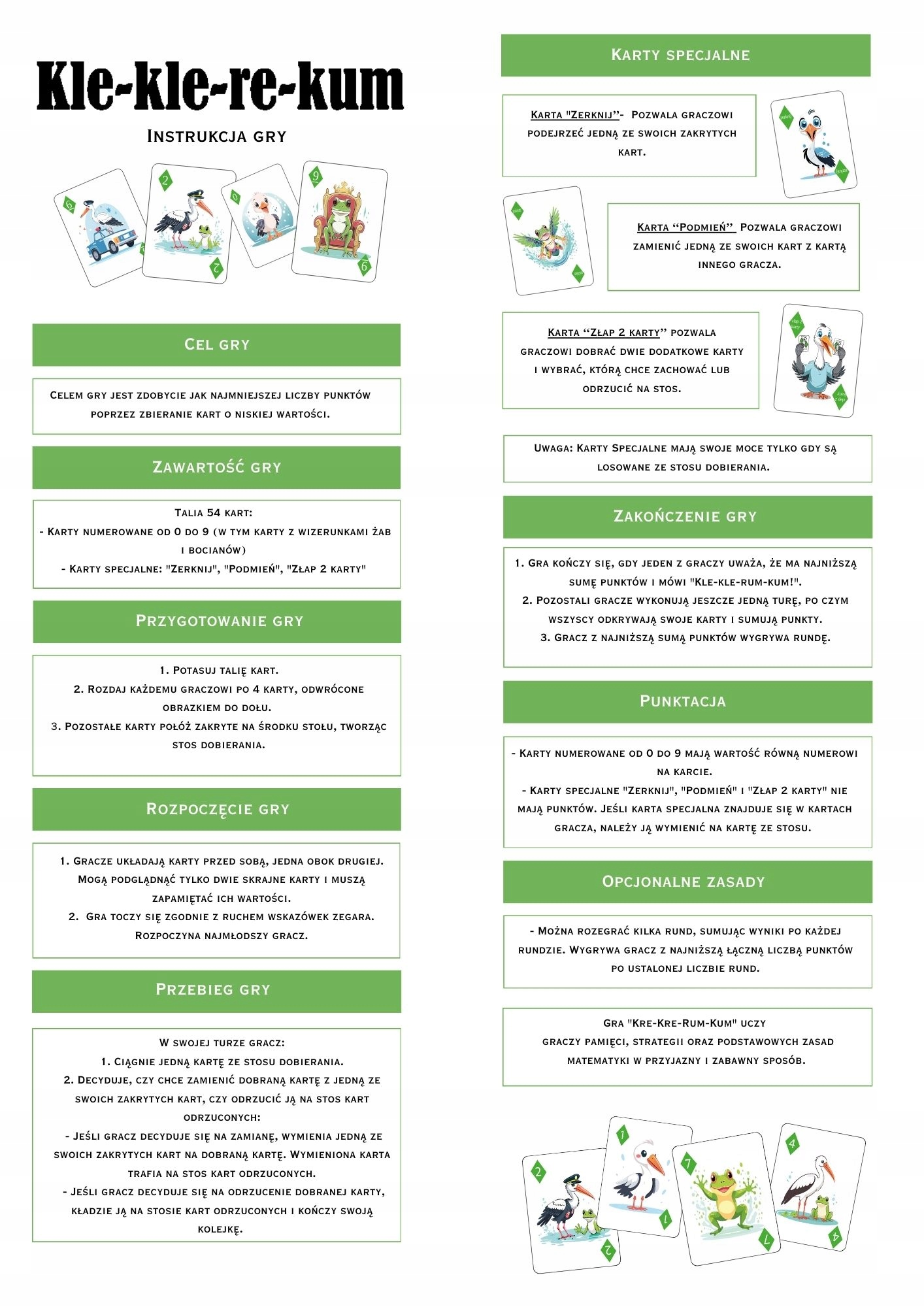 Кле-кле-ре-кум — проста й популярна карткова гра, яка поєднує в собі елементи стратегії, пам’яті та удачі. Гра розвиває математичні здібності, пам'ять і стратегічне мислення. Мета гри — отримати найменшу можливу кількість балів шляхом обміну та запам’ятовування карток.
