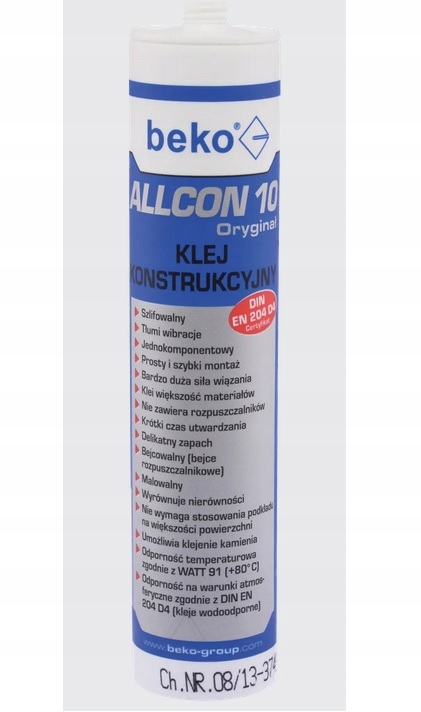 Allcon 10 — однокомпонентний клей. Не містить розчинників. Приклеює практично всі матеріали: дерево, ДВП, ДСП, МДФ, метал, алюмінієві вироби, натуральний і синтетичний камінь (наприклад, Corian і Varicor), бетон, мармур, кераміку, акрил, пластик, гіпсокартон, полістирол, піни, ізоляційні матеріали та ін. . Стійкий до більшості хімікатів і погодних умов (морозостійкий клей). Він досягає дуже високої початкової міцності зчеплення та швидко твердне. Не потребує використання грунтовки, можна фарбувати та лакувати. Він дуже ефективний, безпечний у використанні та простий у застосуванні - наноситься пістолетом для герметика.