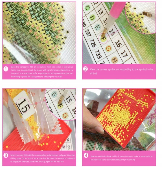 Спочатку підготуйте набір для вишивання. Помістіть намистини в пластиковий лоток і акуратно розкладіть їх в ряд. Потім відірвіть захисну фольгу від воску та спеціальною ручкою для вишивання натисніть на віск, тримаючи бісеринку, та міцно прикріпіть її до вишивки.
