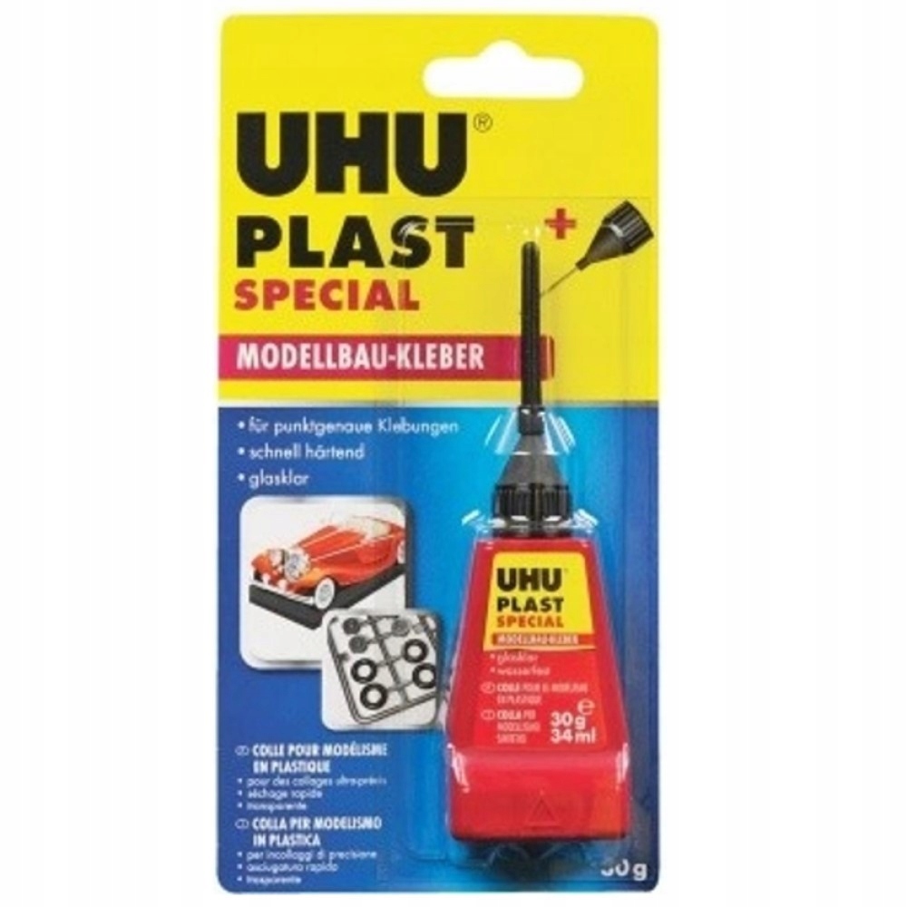 Надзвичайно якісний, прозорий, швидковисихаючий, водостійкий, прозорий клей, призначений для склеювання пластикових моделей, пластику та комбінованого склеювання. UHU plast special досягає високої міцності шляхом розчинення поверхні пластику (холодний зварювання). Завдяки спеціальному голковому аплікатору він також підходить для склеювання вузьких щілин.