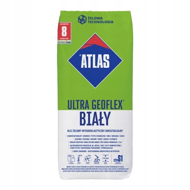 Клей для плитки Atlas Geoflex Ultra white має універсальне застосування. Може використовуватися як на вулиці, так і всередині приміщень для наклеювання плитки. Цей продукт відрізняється ідеальною текучістю і відсутністю течії. Також підходить для великоформатної плитки. Клей можна використовувати на складних основах. Швидко сохне. Ви можете наступати на плитку лише через дванадцять годин.