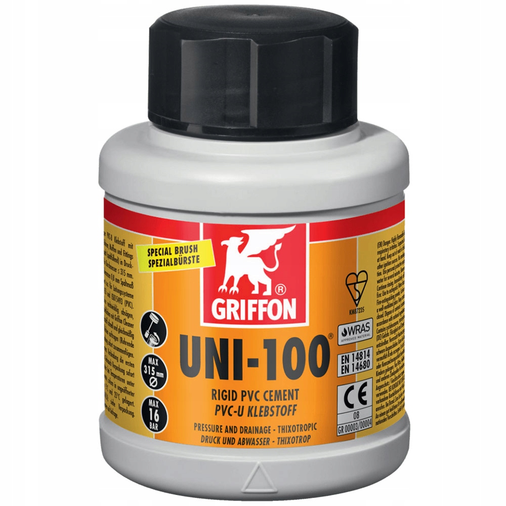 Ми рекомендуємо використовувати засіб для чищення та знімати фаски на кінцях труб або труб перед склеюванням. Для гнучких або робочих з'єднань рекомендуємо спеціальний клей Griffon WDF-05 (також у вкладці вище). Ми вже багато років успішно використовуємо клей для ПВХ Griffon UNI100 в громадських і приватних басейнах. Клей Griffon UNI-100 за міцністю не поступається клеям Tangit. Час висихання клею близько чотирьох хвилин, він підходить для твердого і м'якого ПВХ. Клей для ПВХ Griffon uni100 має агресивні, слаборозчинні властивості, також склеює труби ХПВХ, макс. 16 бар (PN 16).