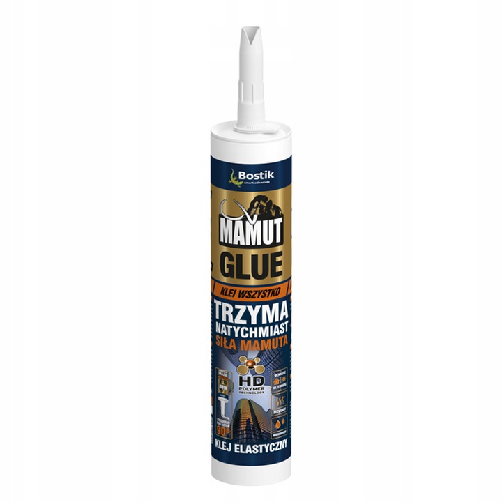 Mamut Glue — однокомпонентний, стійко еластичний, надзвичайно липкий і густий клей на гібридній основі (технологія HD POLYMER), для кріплення важких або важко навантажених матеріалів, в побуті, будівництві та промисловості.