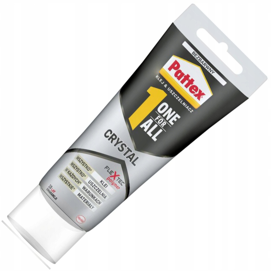 Pattex ONE FOR ALL Crystal - високоякісний універсальний полімерний клей та герметик на основі технології «Flextec polymer». Характеризується кристалічною прозорістю. Призначений для всіх типів матеріалів і поверхонь, у будь-яких умовах. Pattex ONE FOR ALL Crystal склеює та ущільнює внутрішні та зовнішні елементи з абсорбуючих і не абсорбуючих матеріалів.
