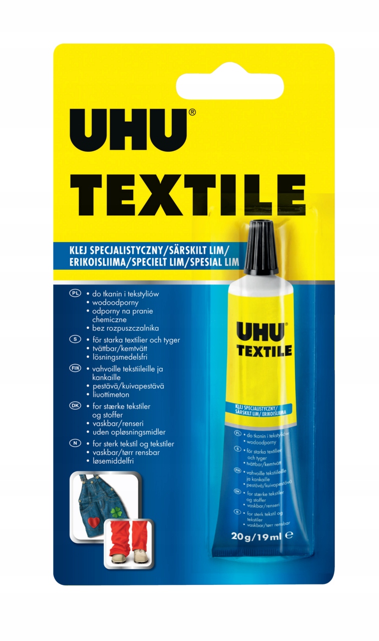 Клей текстильний 19 мл підходить для (під час ) підшивання вельветових штанів і джинсів, латання дірок і розривів на одязі та оздоблювальних матеріалах (наприклад, куртках, штанах, наметах, шезлонгах і вітровках), нанесення повстяних аплікацій, окантовка килимків і килимів, а також прикріплення текстилю до дерева, столярних плит, ДСП і ДВП.