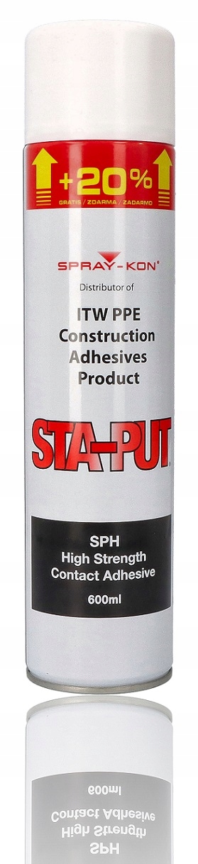 SPRAY-KON STA-PUT — контактний клей із дуже міцним зв’язуванням. Ефективно та бездоганно склеює більшість матеріалів, таких як: необроблені та ламіновані меблеві дошки, ламінат HPL, кромки, шпон, ПВХ, листовий метал, дзеркала, пробку тощо. Характеризується високим вмістом твердих часток, водостійкістю та постійною еластичністю . Забезпечує стійке до високих температур зчеплення.