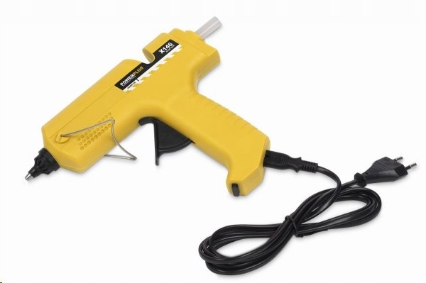 Плавильний пістолет PowerPlus, живлення від мережі та акумулятора. Після затвердіння клей міцний, стійкий до стирання та водостійкий. Чорно-жовтий.