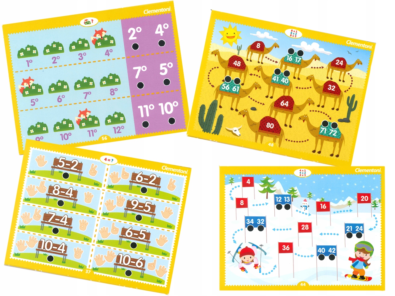 - 30 двосторонніх дощок із 60 завданнями (16 дощок – набори та номери; 3 дошки – простір і розміри; 9 дощок – більшість, меншість і рівність ; 5 дощок - числові ряди та порядкові числівники; 10 дощок - додавання і віднімання; 13 дошок - таблиця множення; 4 дошки - логічні завдання)