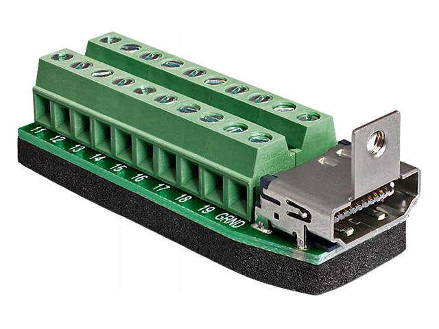 Пропонований роз’єм – це 19-контактний роз’єм HDMI типу A. Розетка завершується швидкими гвинтовими з’єднувачами (так званими TERMINAL BLOCK), позначеними цифрами 1-19 і GRND, що дозволяє легко і надійно підключати 20 проводів діаметром до 1,8 мм кожен (AWG27~AWG14)