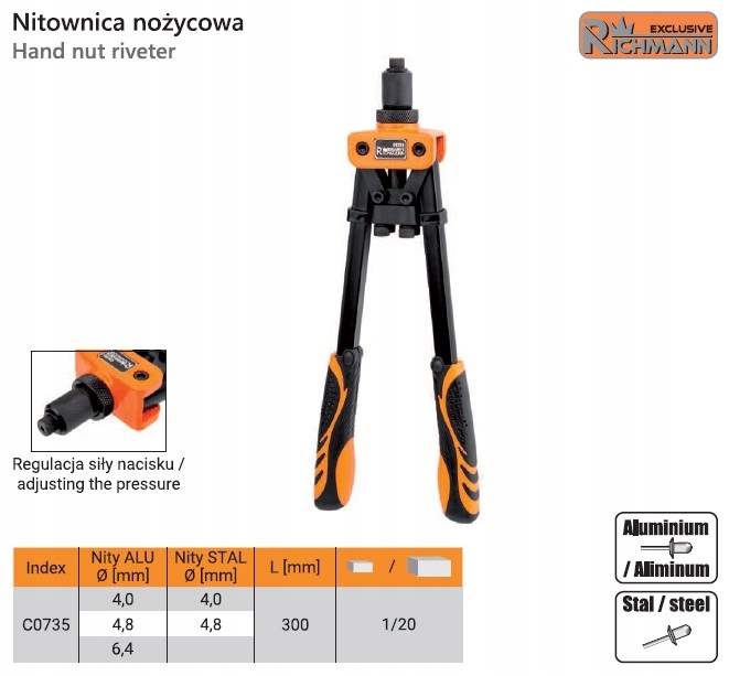 КЛЕПАЛЬНИК ДЛЯ СТАЛЕВИХ ТА АЛЮМІНІЙНИХ ЗАКЛЕПОК 4-6,4 мм C0735