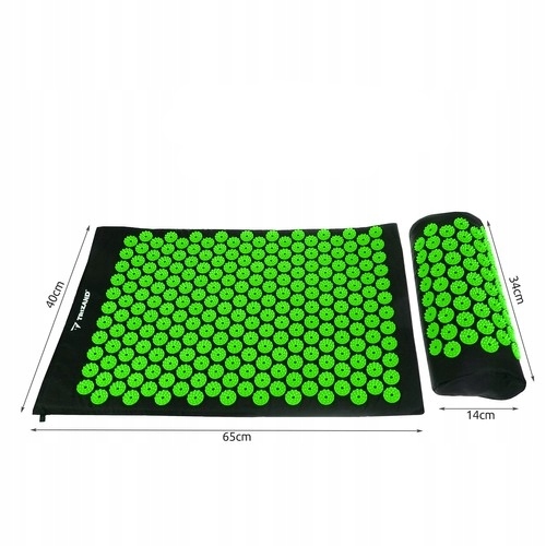 ✓ СПЕЦИФІКАЦІЯ – колір: чорно-зелений; матеріал: бавовна / пластик / піна; розміри килимка (довжина/ширина/висота): 65/40/2см; кількість розеток на килимку: 230; кількість точок тиску на килимок: 6210; розміри подушки (довжина/ширина/висота): 14/11/34см; кількість розеток на подушці: 59; кількість точок тиску на подушку: 1593; ; вага набору: 0,713 кг.