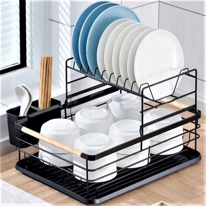 ✅ ✅ страви дуже висока якість і міцна та металева конструкція . Лоток, виготовлений з смоли, захищає стільницю від мокри. Набір також включає пластиковий, двокамбер крапельниці для столових приборів . Металева чорна сушарка з дерев’яними ручками - це елегантне рішення для кожної кухні.