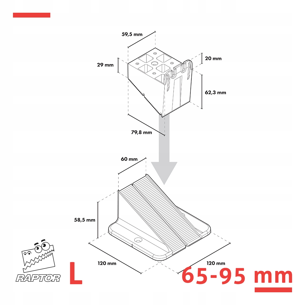 Кронштейни RAPTOR складаються з двох основних елементів - клина та основи. Висота від 125 мм створюється шляхом додавання подовжувальної основи до основних опор.