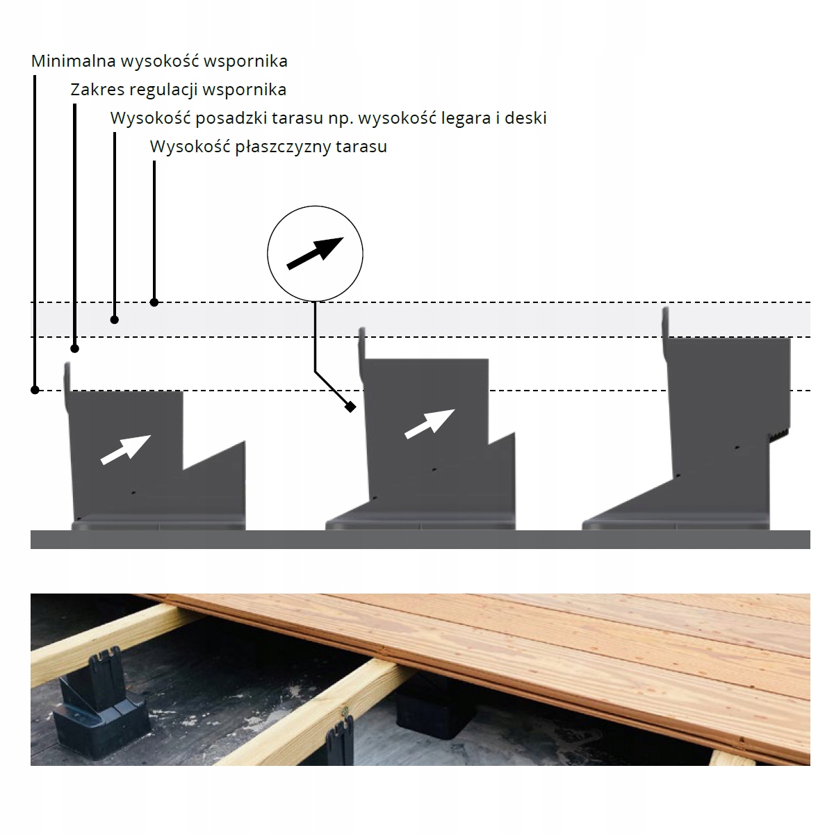 Кронштейни серії РАПТОР призначені для влаштування терас на балках. Вони мають крокове регулювання приблизно через 1 мм. Завдяки відповідній конструкції їх можна використовувати на терасах, побудованих як на дерев’яних балках, так і на алюмінієвих або композитних балках. Завдяки широкій основі забезпечують стійку підтримку. Функціональність кронштейнів можна розширити за допомогою додаткових аксесуарів.
