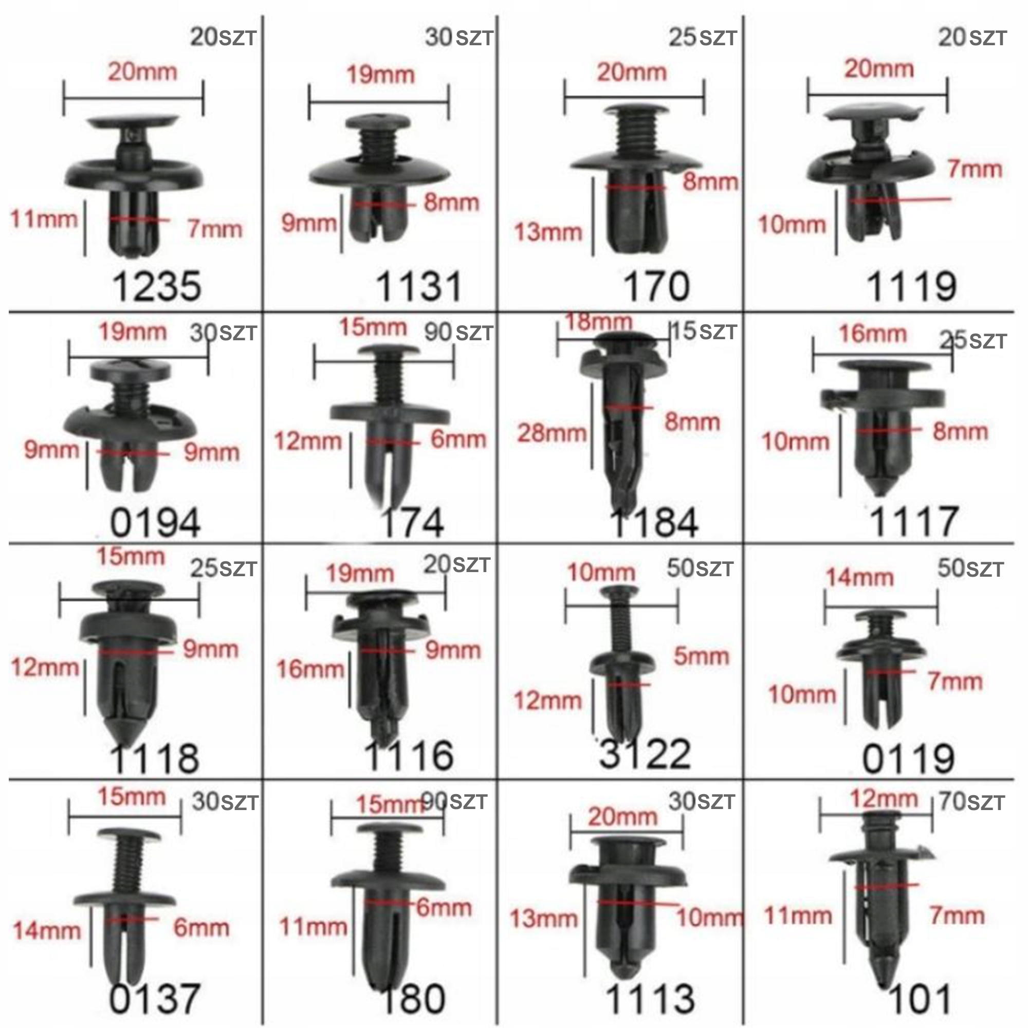 ✅ Ідеальна підгонка: Елементи в наборі були ретельно підібрані для різних моделей і марок автомобілів. Незалежно від типу оббивки чи року випуску вашого автомобіля, наші шпильки, шпильки та затискачі забезпечать точне та безпечне кріплення.
