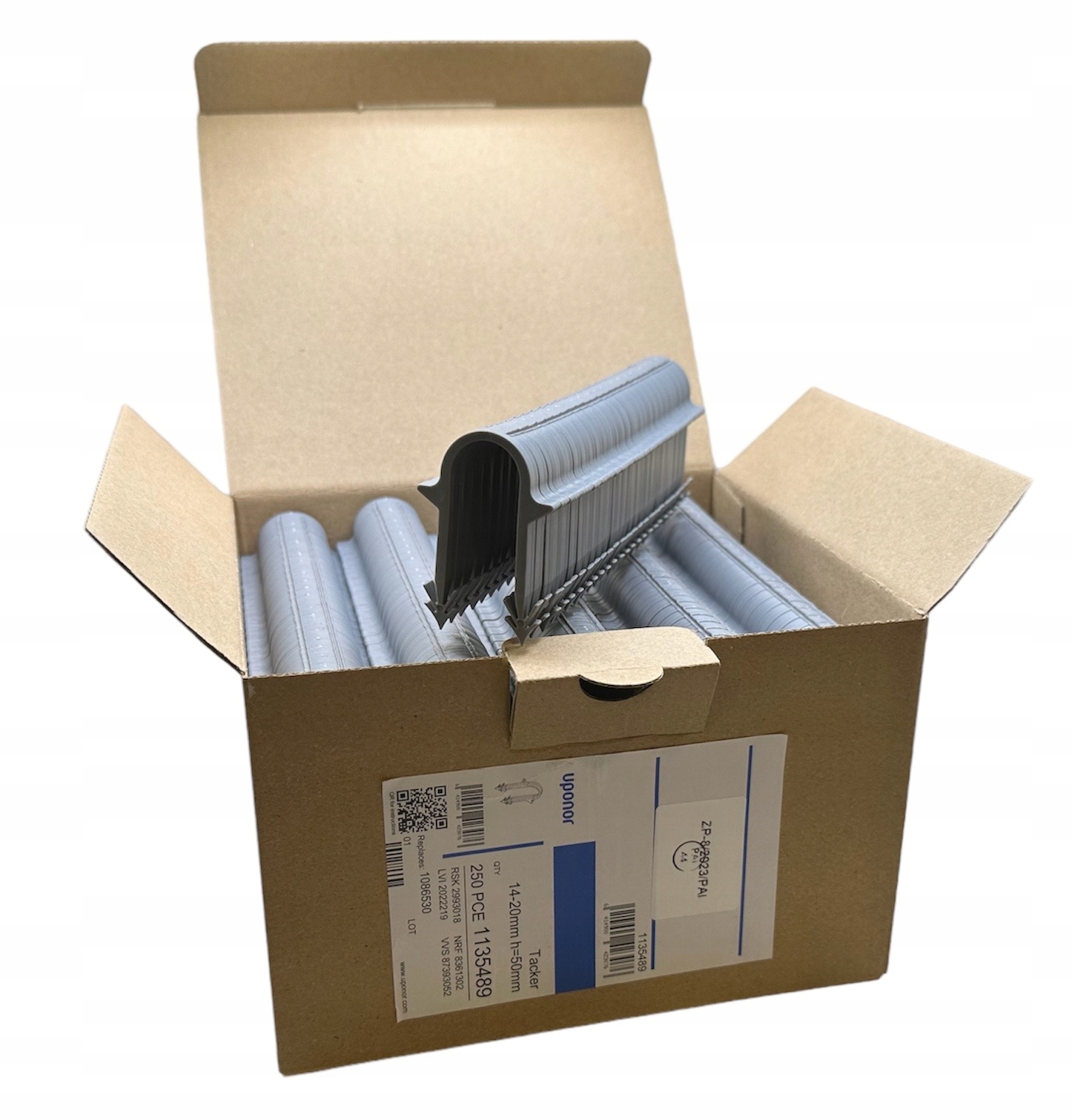 50-міліметрові зварні скоби від Uponor використовуються для кріплення труби теплої підлоги до ізоляційного шару пінополістиролу. Залежно від товщини та щільності ізоляційного шару пінополістиролу використовуються кліпси відповідної довжини та способу кріплення.