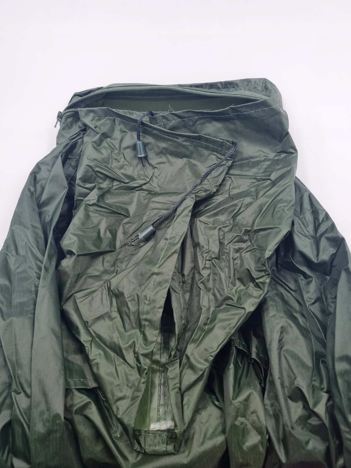 Захисний плащ виготовлений з високої якості тканини з 100% поліестеру/ПВХ , гарантує відмінний захист від дощу. Закріплений блискавкою та додатковими пресами. Гуд закритий на комірі та завантажені ремінці дозволяють швидко вміститися, забезпечуючи захист від повної голови.