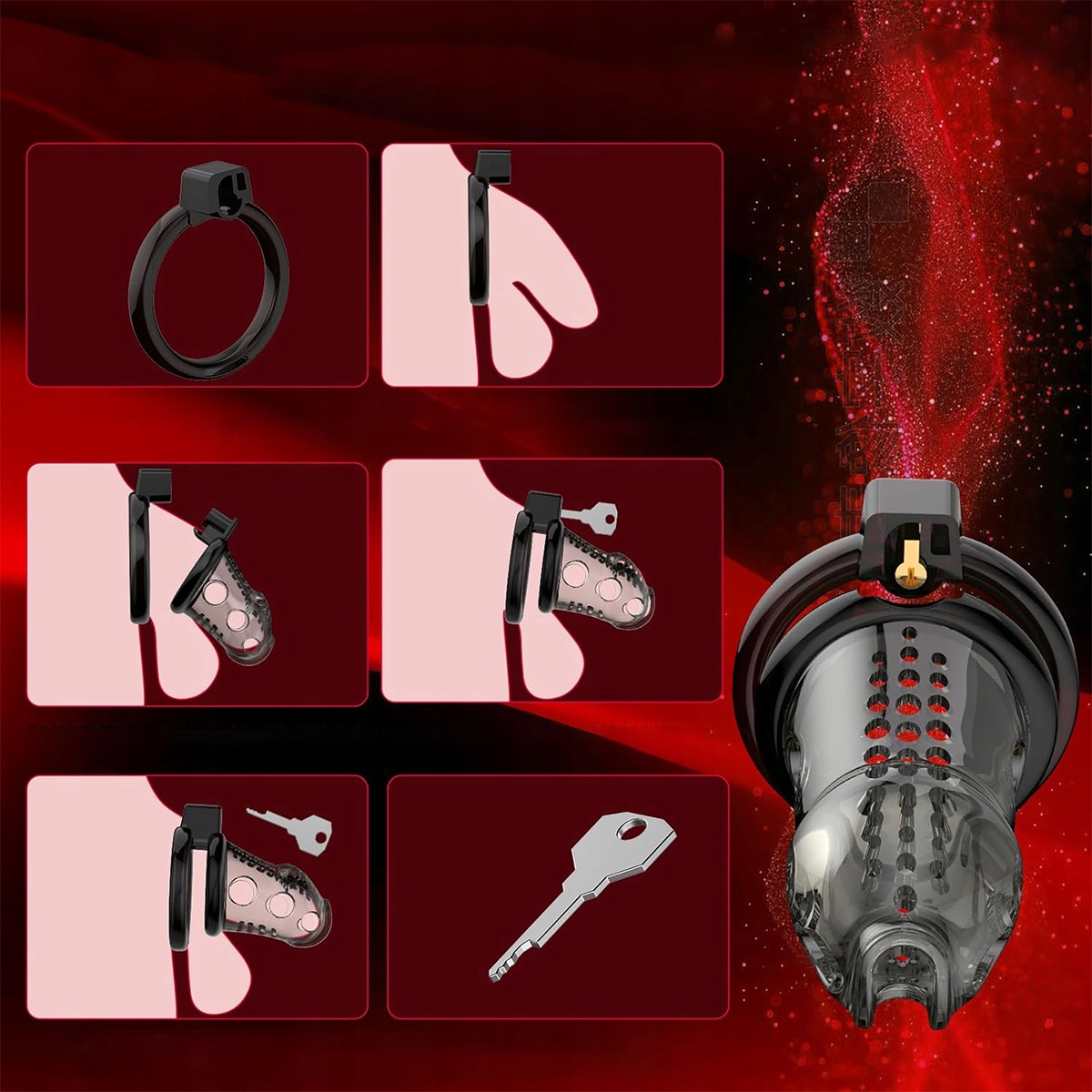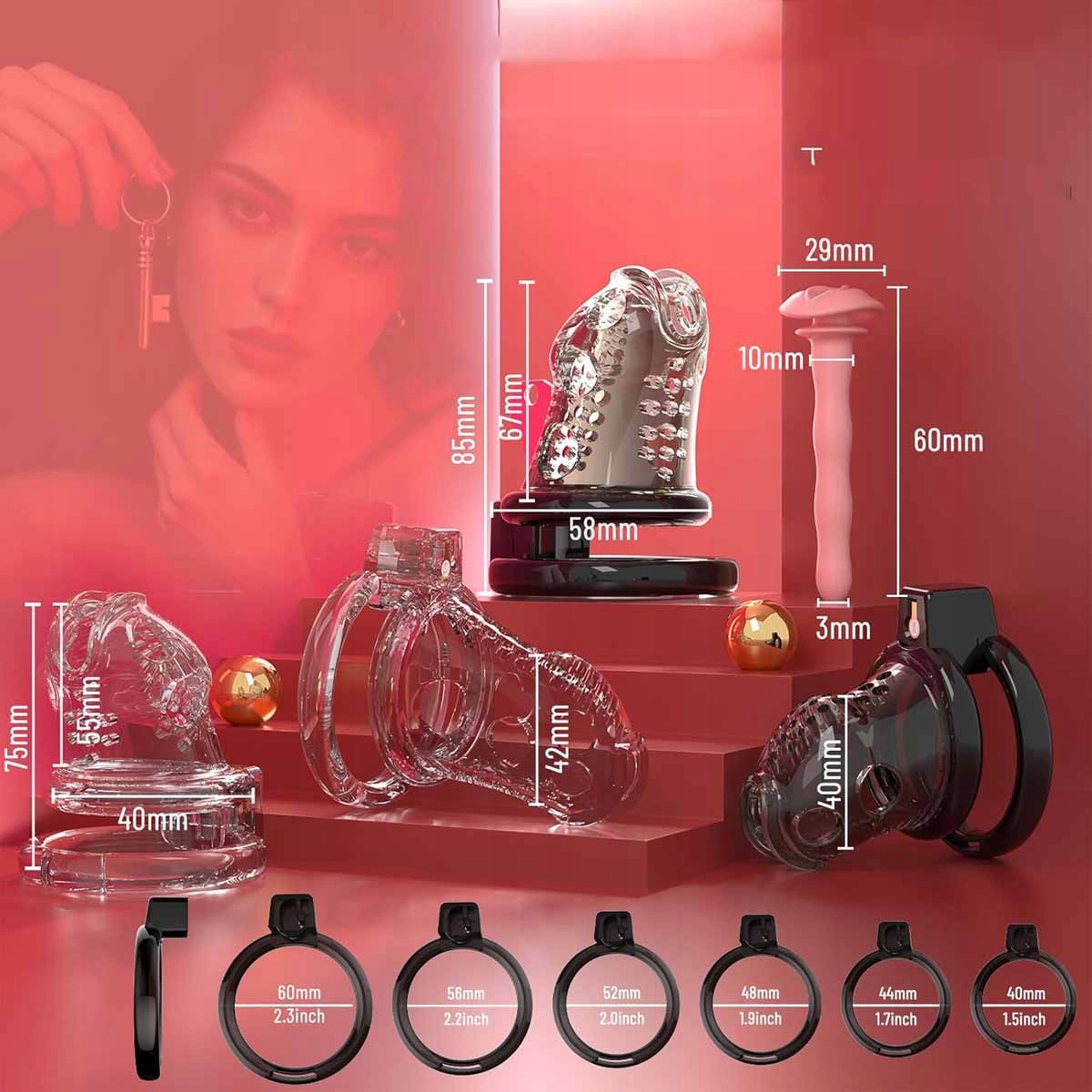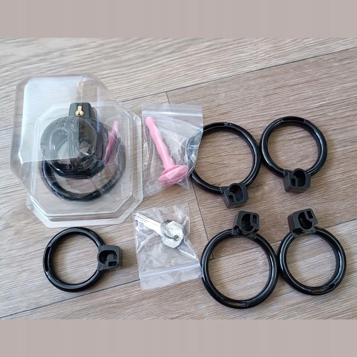 Включає 1 клітку для цнотливості, 6 різних розмірів каблучок, 2 ключі, 1 замок і 1 уретру.