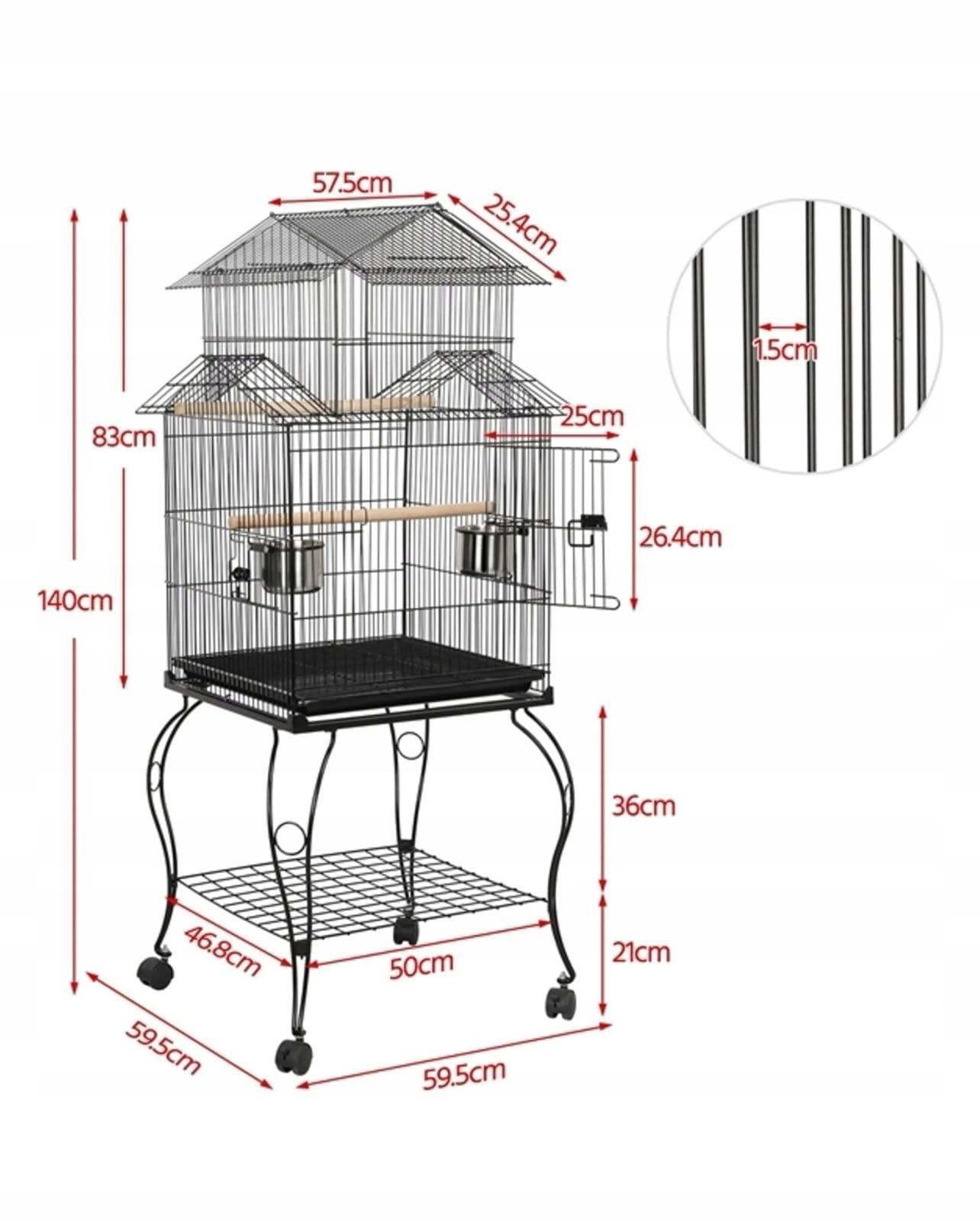 для малих та середніх птахів : рамка з розміром 59,5 × 59,5 × 139,5 см, з відстань 1,5 см між стрижнями, він забезпечує адекватну простору для пазуехек, канери, ніци та інші невеликі.