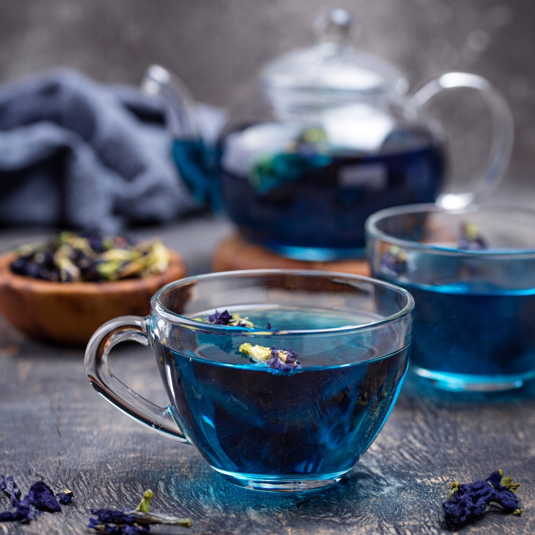 Clitoria ternatena також відомий як чай з гороху метелика. Це природна тропічна рослина. Має характерний трав’яний смак і аромат, надзвичайно ніжний і навіть оксамитовий на смак.