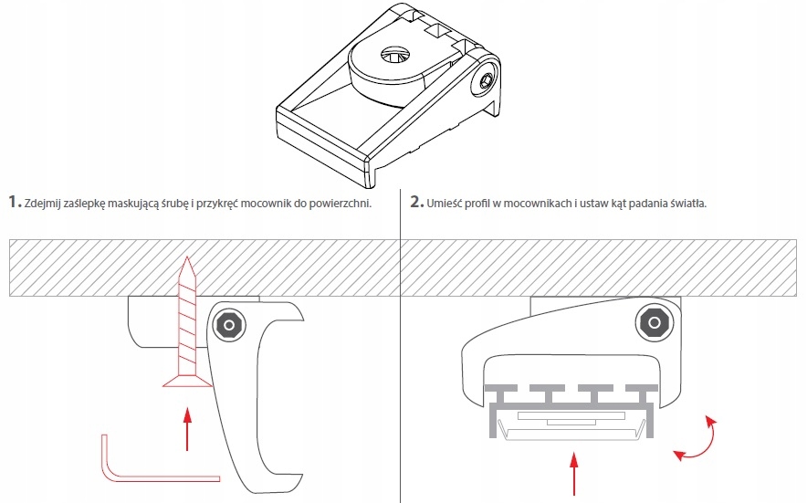 Регульований монтажний кронштейн для алюмінієвих профілів марки KLUŚ. Дозволяє легко та зручно встановлювати на будь-яку поверхню, при цьому допускає широкий діапазон регулювання кута падіння світла.