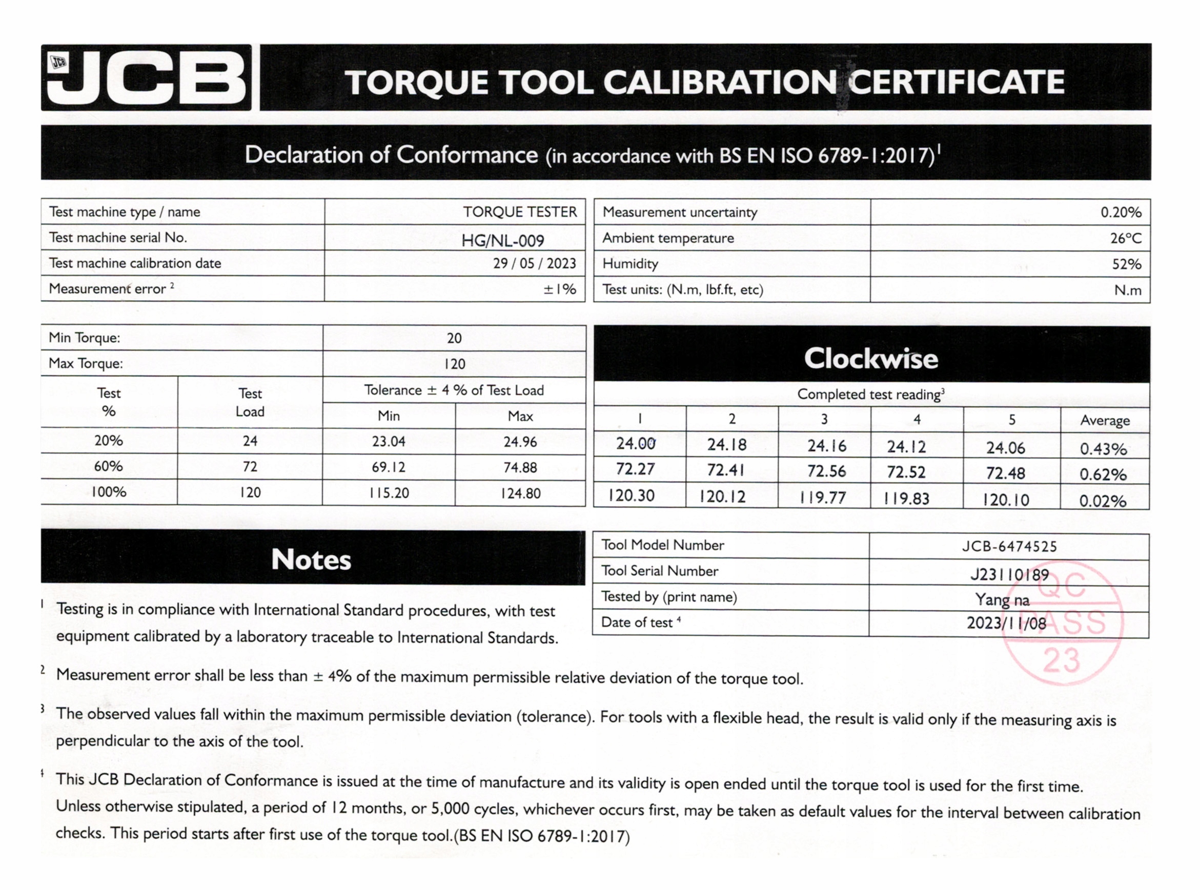KLUCZ DYNAMOMETRYCZNY Z BLOKADĄ CERTYFIKAT KALIBRACJI ETUI 100-600 3/4" JCB