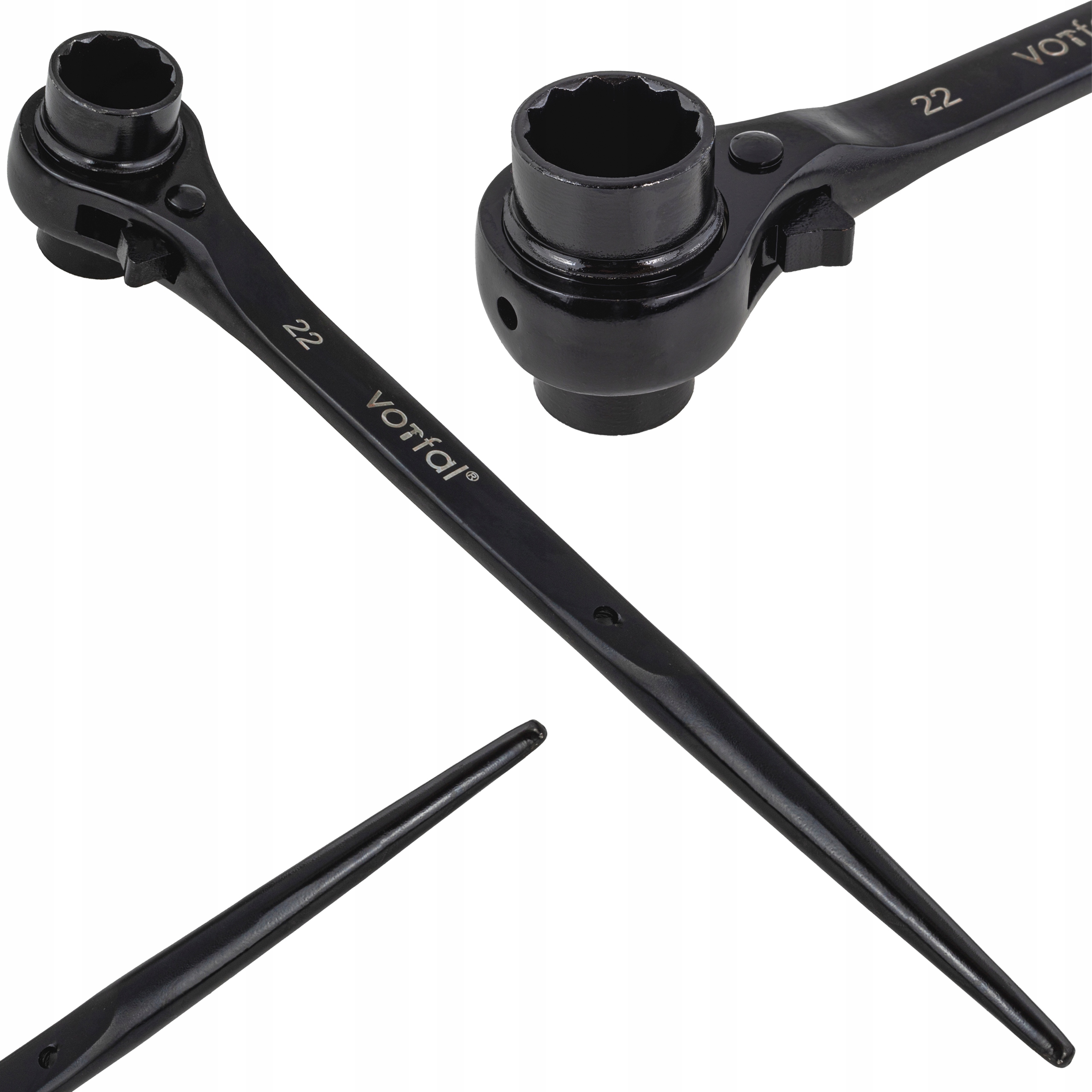 Універсальний професійний гайковий ключ для риштувань. Ідеально підходить для монтажу та демонтажу будівельних лісів. Виготовлений методом кування, загартований і оксидований. Стійкий до корозії ключ. Довге плече гайкового ключа дозволить відкрутити застряглі з'єднання. Загострений наконечник допоможе підчепити і розсунути демонтовані елементи. Гайковий ключ оснащений перемикачем напрямку храповика вліво/вправо. Завдяки отвору в ручці його можна прикріпити та закріпити під час роботи на висоті.