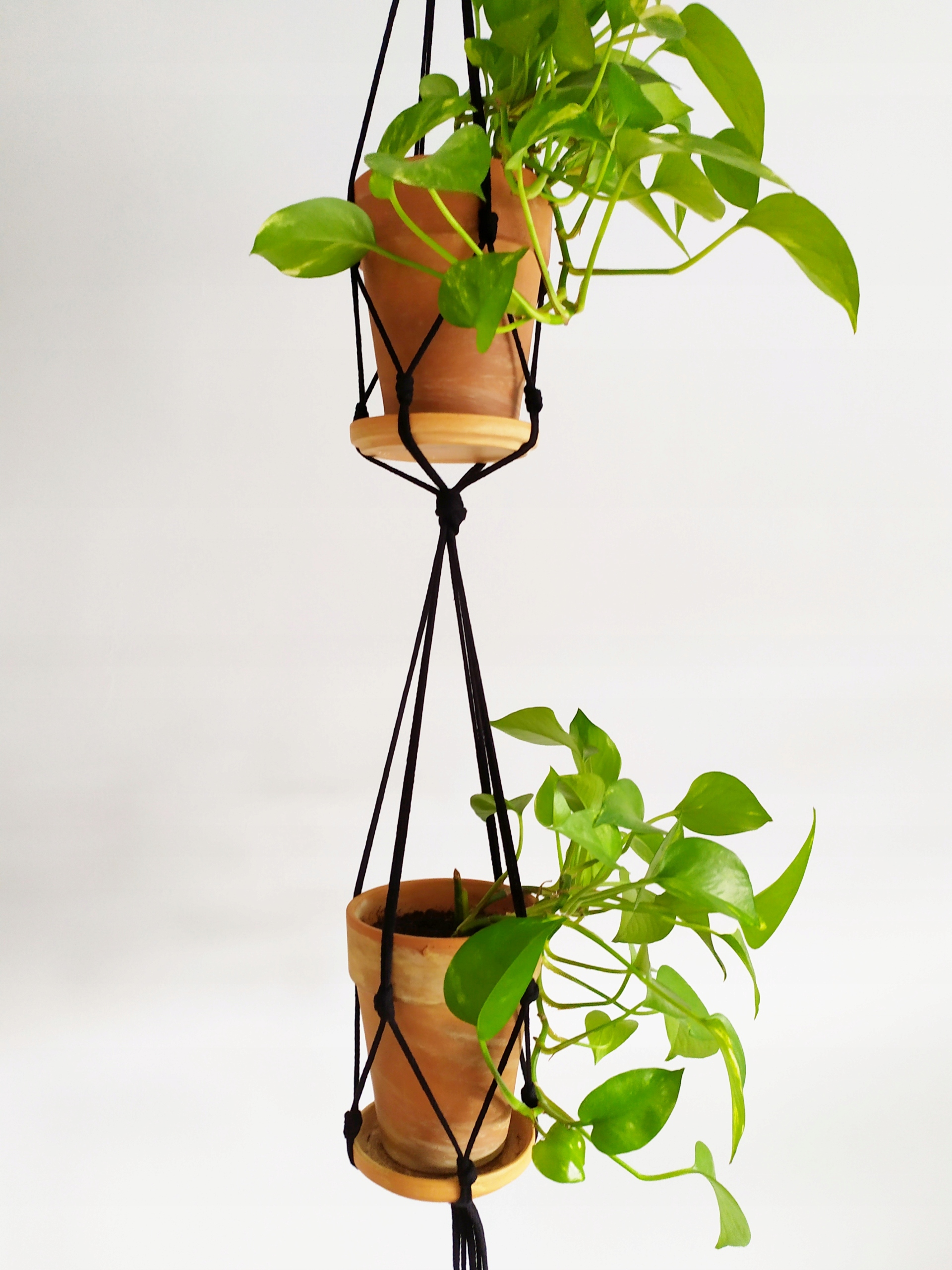 Це ручна підставка для квітів із чорної бавовняної нитки, у ній є місце для двох квіткових горщиків.