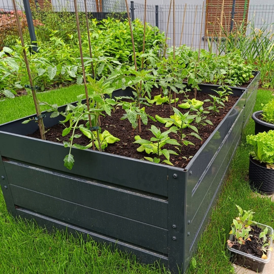 Надзвичайно стабільна та міцна садова грядка, виготовлена з оцинкованого металевого листа 1 мм товщиною вирізаного лазером і, що важливо, не має гострих країв і була додатково пофарбована після процесу згинання порошковим покриттям в зелений RAL 6005. У грядки з товщиною стінки 1 мм обрізані ніжки, щоб було легше встромити її в землю. Закріпіть ліжко за допомогою гвинтів з нержавіючої сталі в колір ліжка.