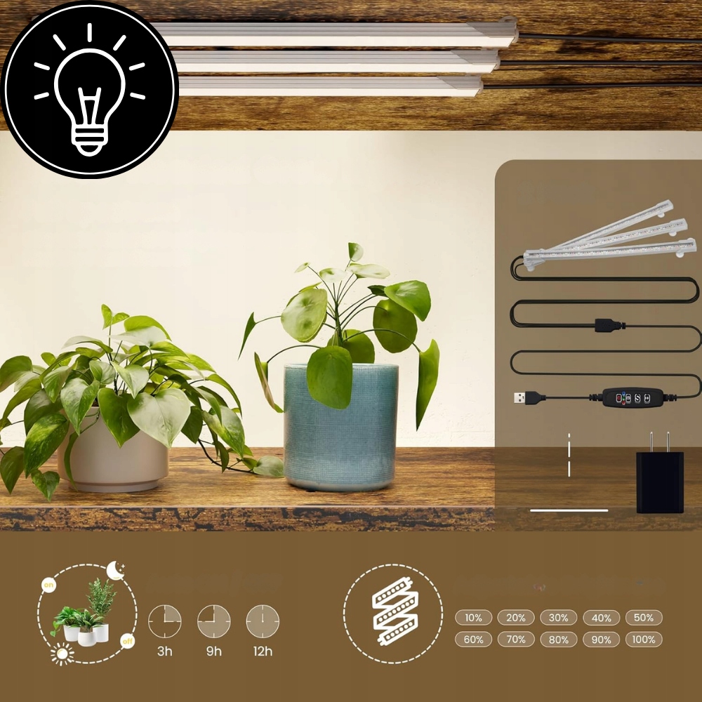Полка оснащена трьома лампами для вирощування рослин, кожна з яких має вбудований таймер і до 10 рівнів регулювання яскравості. Завдяки цьому ви можете легко регулювати інтенсивність і час освітлення відповідно до потреб різних видів рослин і умов у квартирі.