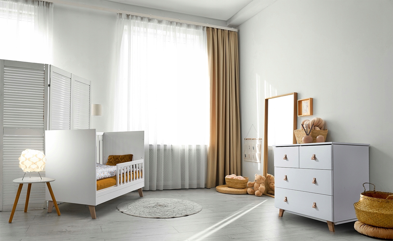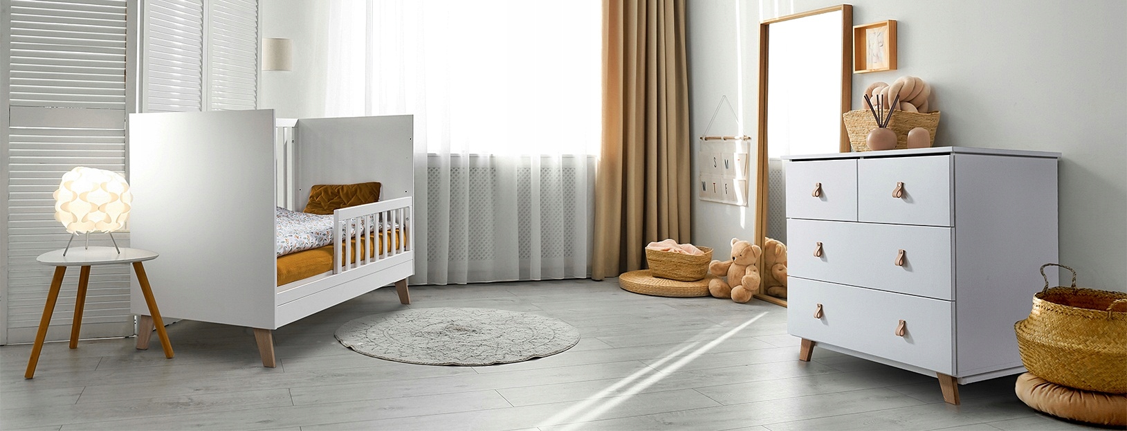 Колекція NOAH – Гармонійне поєднання благородного білого і натурального покриття зробить меблі NOAH корисними не тільки для малюків. Після встановлення бар'єру безпеки ваш малюк зможе спокійно спати у місці, яке він завжди знав. Знявши пеленальний столик з комода, ви отримаєте предмет меблів, який стане елегантним доповненням не тільки дитячої кімнати. М'які на дотик шкіряні ручки роблять використання комода приємним. Дубові ніжки додатково підкреслюють стильний характер комплекту.