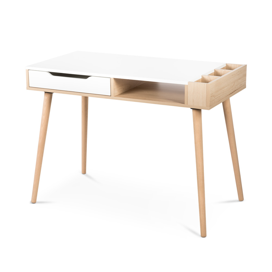 Сучасний дизайн: письмовий стіл SOFIE кольору бук-білий виглядає сучасно та стильно. Поєднання світло-білого кольору з теплим відтінком деревини бука надає йому унікальний характер, який підходить для різноманітних інтер’єрів.