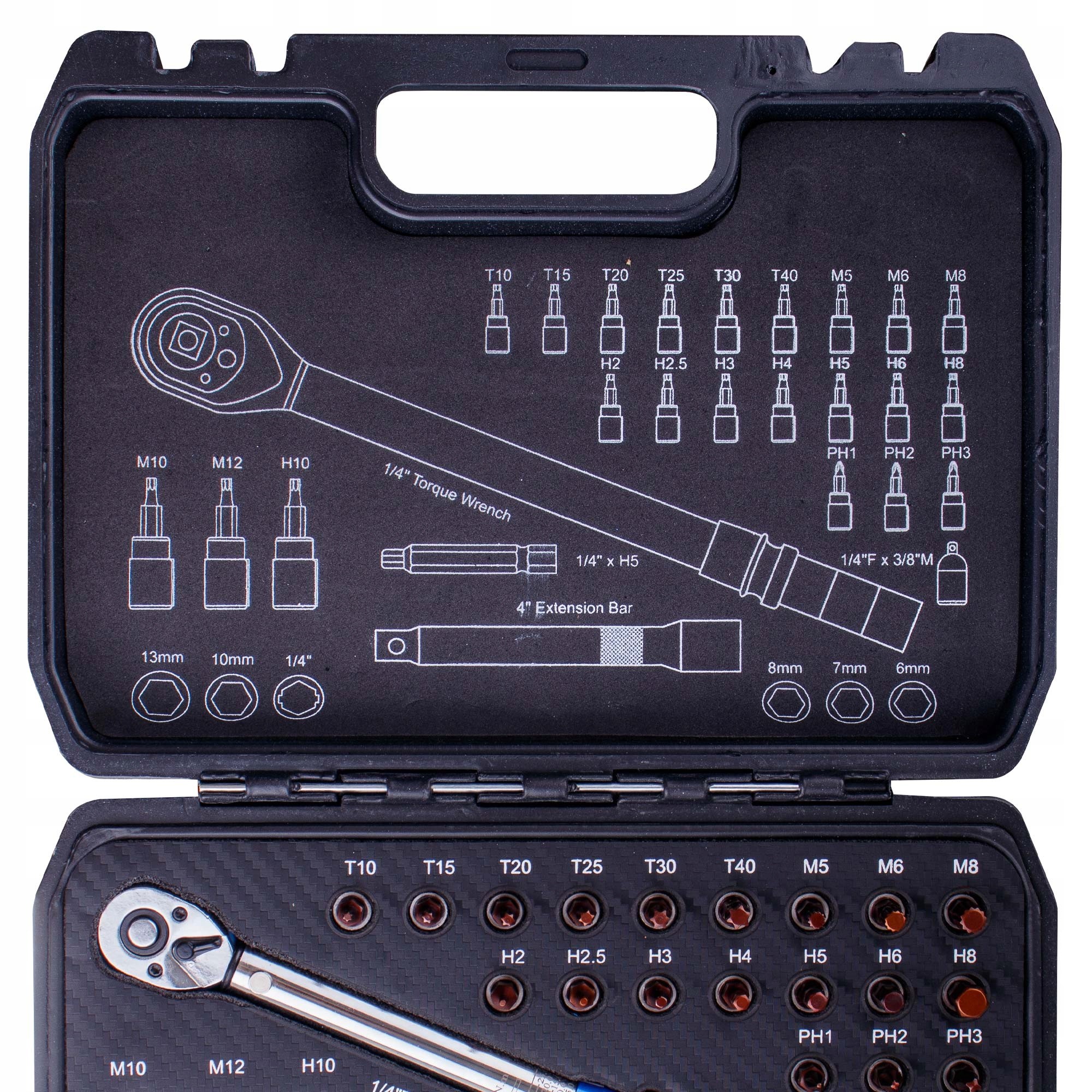 Ключ динамометричний 1/4" 5-25 Нм ДВОСТОРОННИЙ з головками 32 шт. ЗАМОК