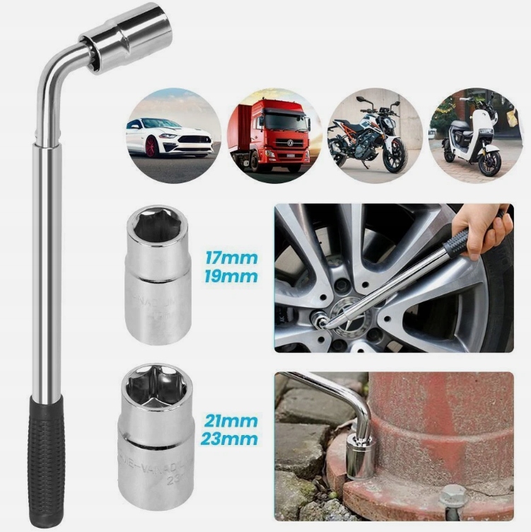 ✔️Твердий і функціональний колісний ключ L-типу, оснащений двостороннім наконечником 17x19 мм і можливістю регулювання довжини плеча від 350 до 510 мм. Ідеально підходить для обслуговування коліс у легкових автомобілях і фургонах, поєднуючи комфорт використання з надійністю.