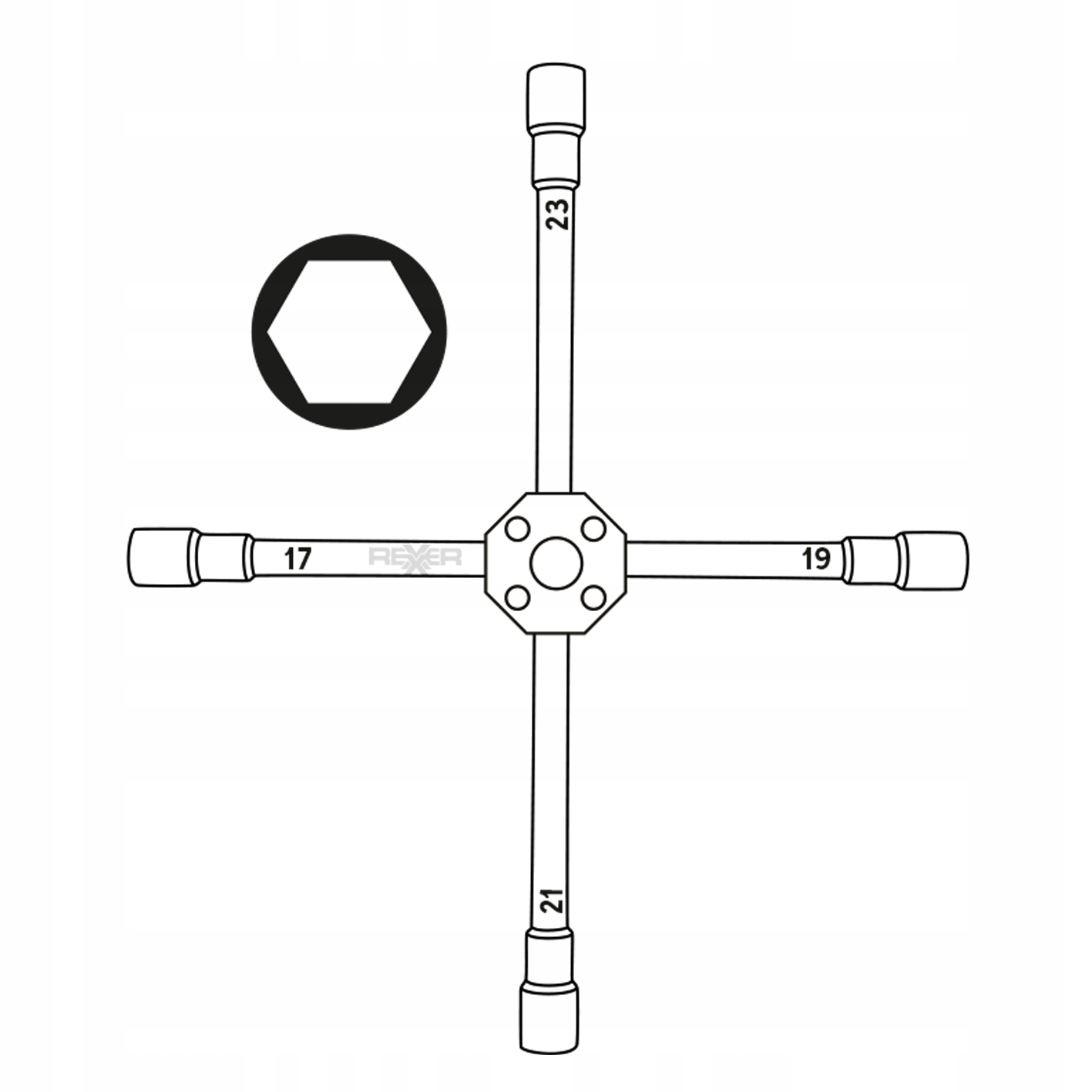 Практична та міцна хрестовина ключа REXXER - невід'ємний елемент обладнання кожного автомобіля та майстерні. Завдяки чотирьом найпоширенішим розмірам гнізд (17 / 19 / 21 / 23 мм) він підходить для більшості колісних болтів.