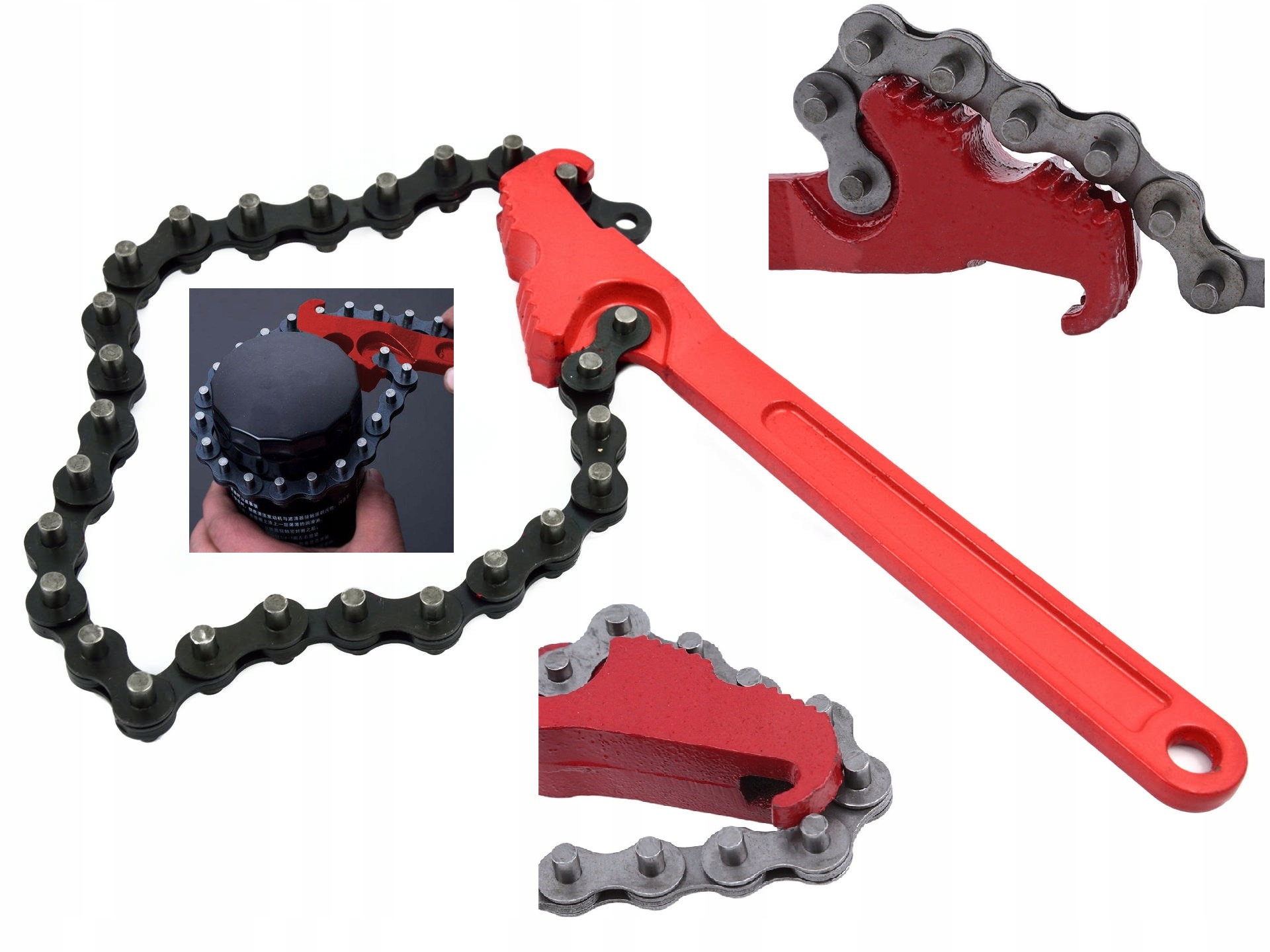 Ланцюговий ключ для масляних фільтрів, оснащений міцним ланцюгом довжиною 41 см, що дозволяє працювати з фільтрами діаметром до 125 мм.